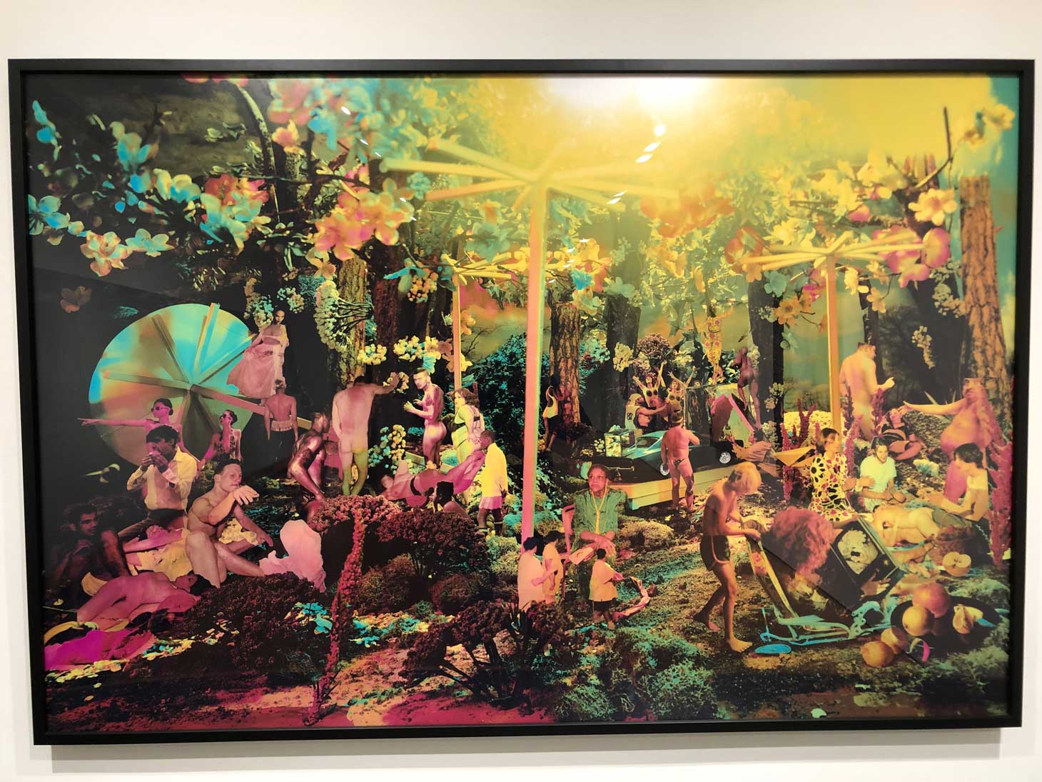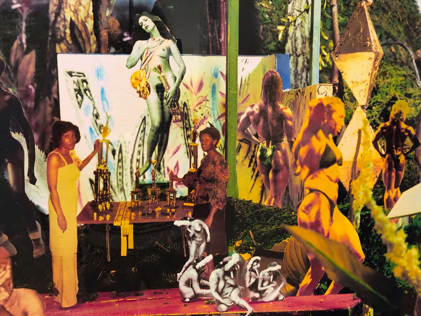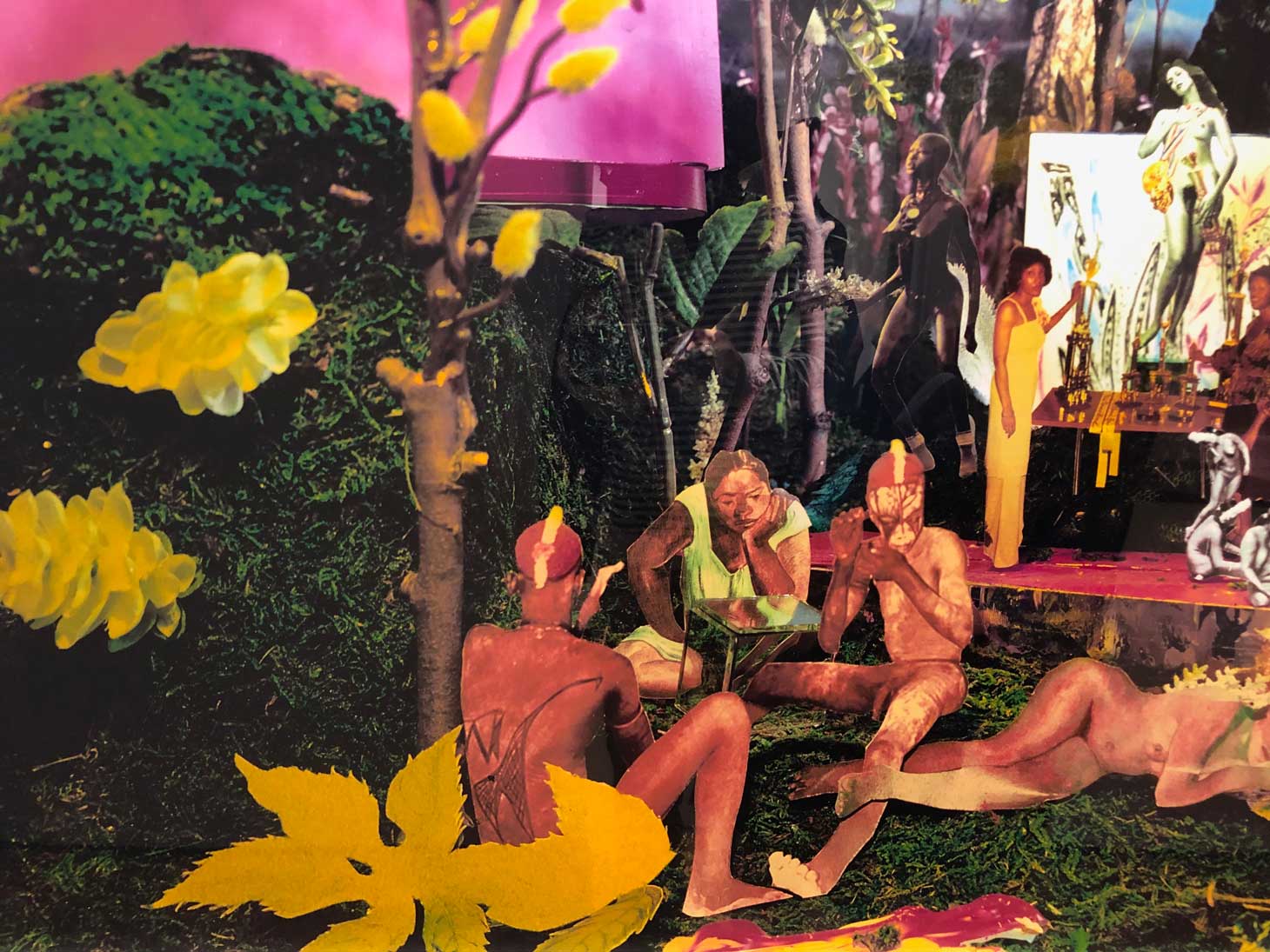 Echoes features contemporary artists, including Krista Franklin and Derrick Adams, whose work draws on Arnold’s confessional model of collage and meaning-making. Paul Mpagi Sepuya’s “Studio (OX5A0202)” and “Studio (OX5A0173)” (both 2017) assemble images of Sepuya and nude white figures together with sketches by Richard Bruce Nugent. Nugent’s sketches play with exoticism and queerness, depicting nude bodies engaging in camp poses and same-sex sex acts. The images are placed atop what appears to be a mirror photograph. These images collide into a composite of the art studio, alluding to the overlaps and interconnections between work by different generations of artists. Likewise, Wardell Milan’s “Early Spring, The Charming Evening” (2014) pairs representations of gender and sex norms with those of queer sex acts and intimacy. Milan emphasizes the place of women in his confessional. Women are adored by male figures; in addition, Black female figures celebrate one another, literally giving each other awards. The greens and pinks of the landscape are accentuated by the yellow hue of the photograph, imbuing it with a fantastical quality.