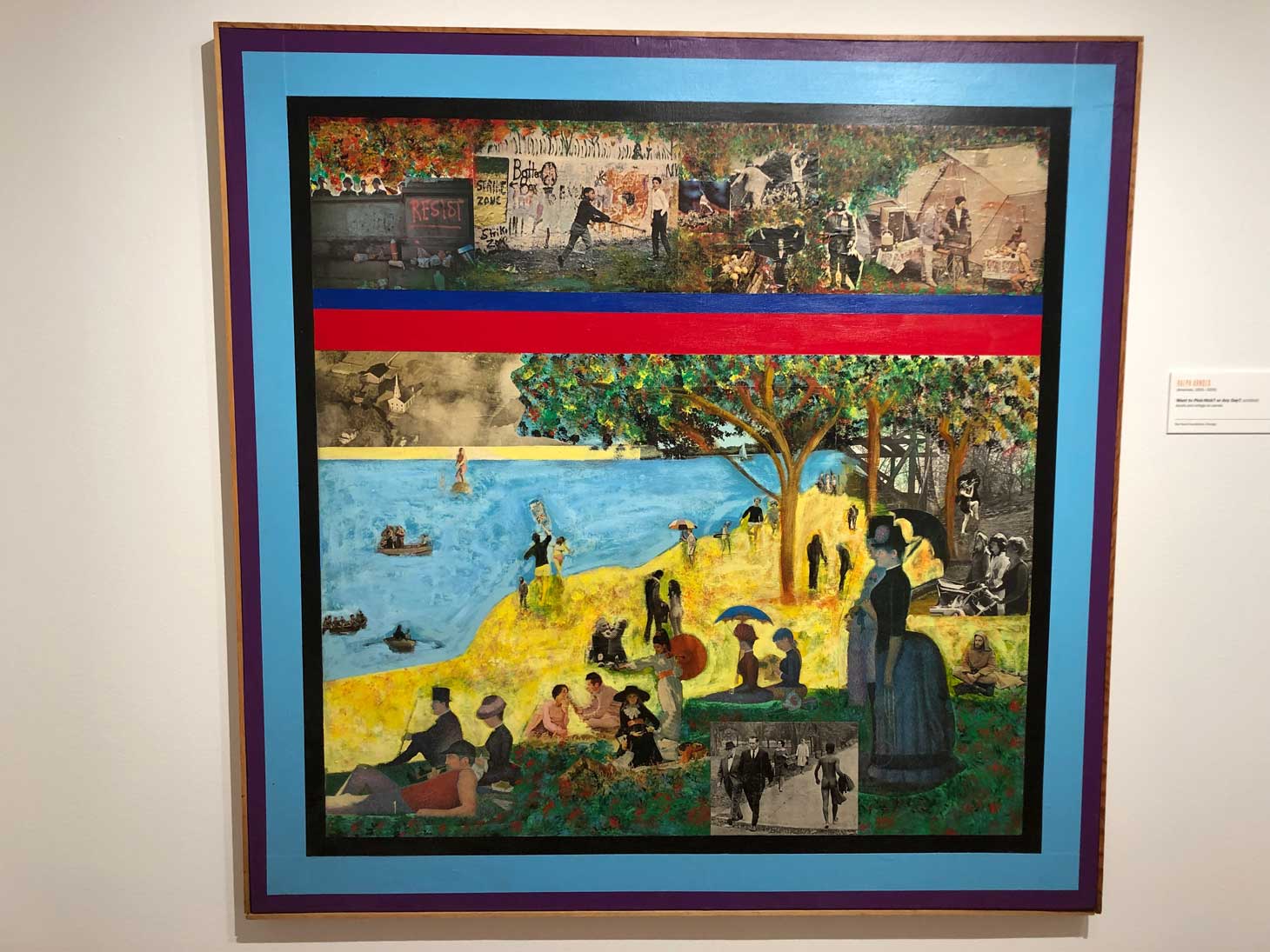 Arnold creates a Black iconography by integrating Blackness into mainstream white imagery. “Want to Pick-Nick?” or “Any Day?” (ca. 1969) takes the famous Seurat painting “A Sunday Afternoon on the Island of La Grande Jatte” (1884) and inserts photographs of counterculture protests, including an image of what appears to be a naked Black man walking past white onlookers. The collage counters canonical Western visuals with the discontent of unseen and unheard people, underscoring how various forms of oppression (colonial, racial, sexual, etc.) are inherently tied to the leisure of the ruling classes.