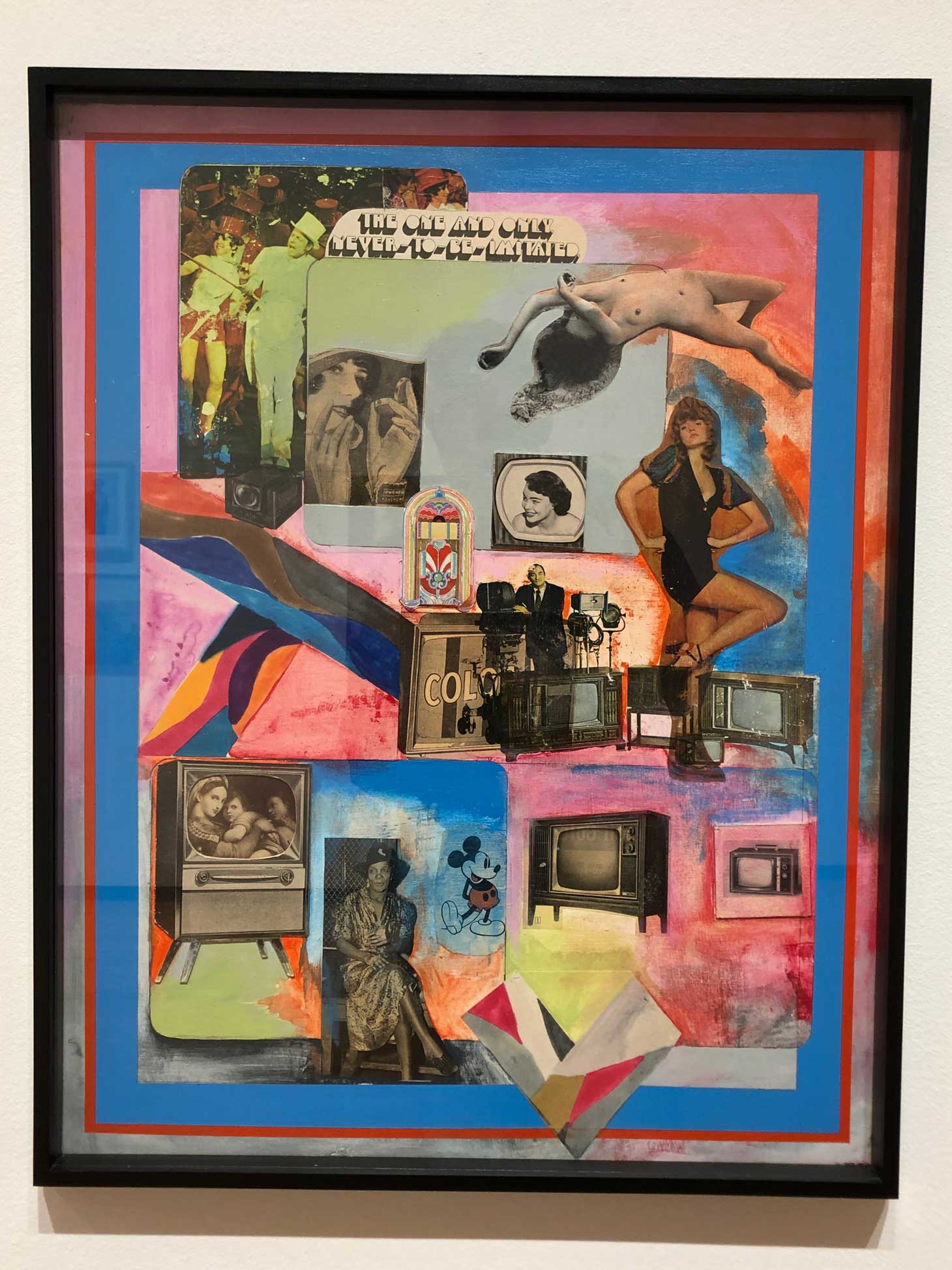 In “Lucas T.V.” (1971), for example, Arnold creates a tableau using the visual margin material of 1970s news broadcasts and game shows. The piece emphasizes these often overlooked aspects of television, highlighting what mainstream TV, as a reflection of mainstream America, displays and what it wishes to hide, namely differently gendered and racialized bodies. In this work, artist Lucas Samaras’s photo of his obscure and “ambiguous” (borrowing the exhibit’s term) genitals parallel an unidentifiable body above.