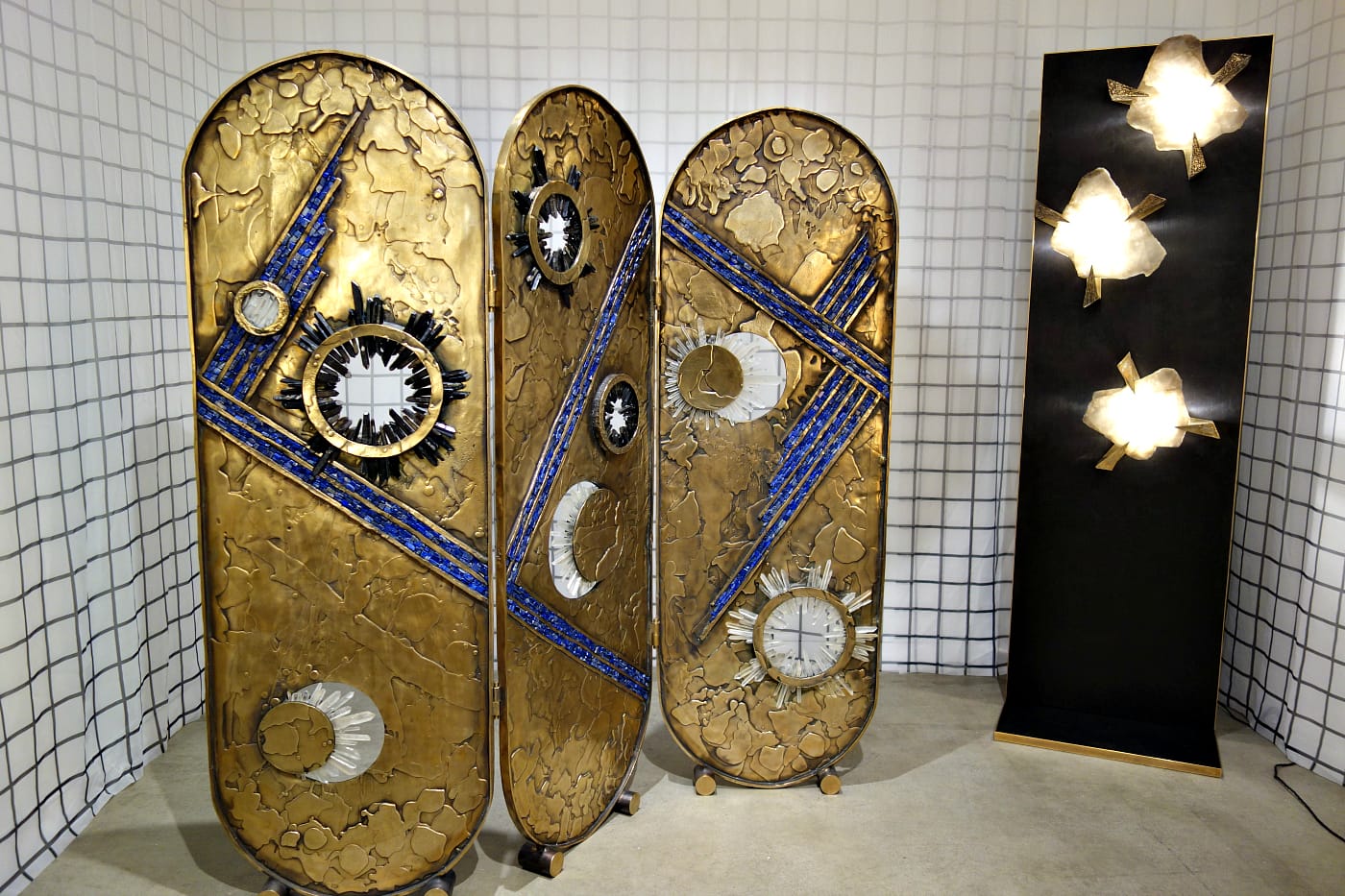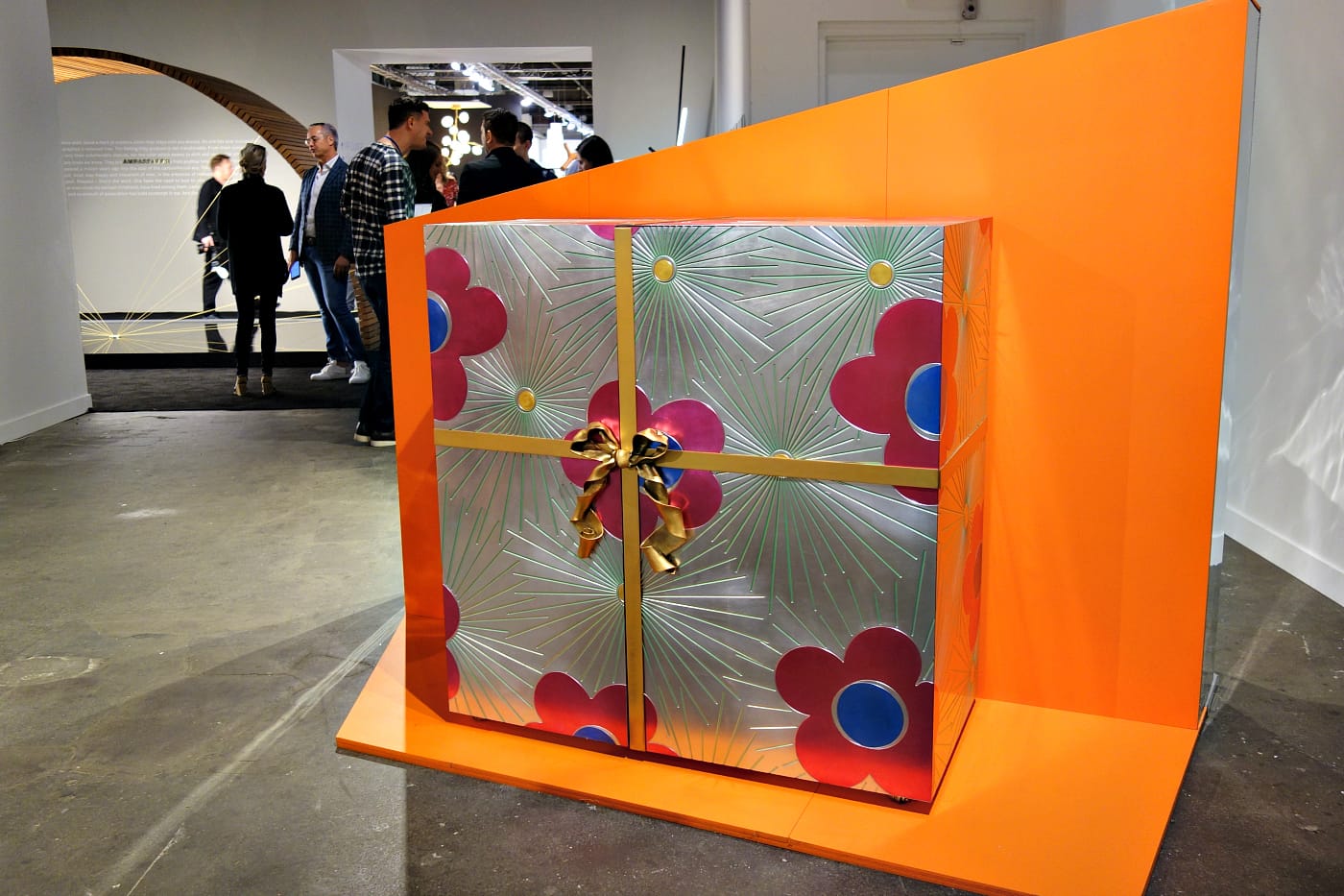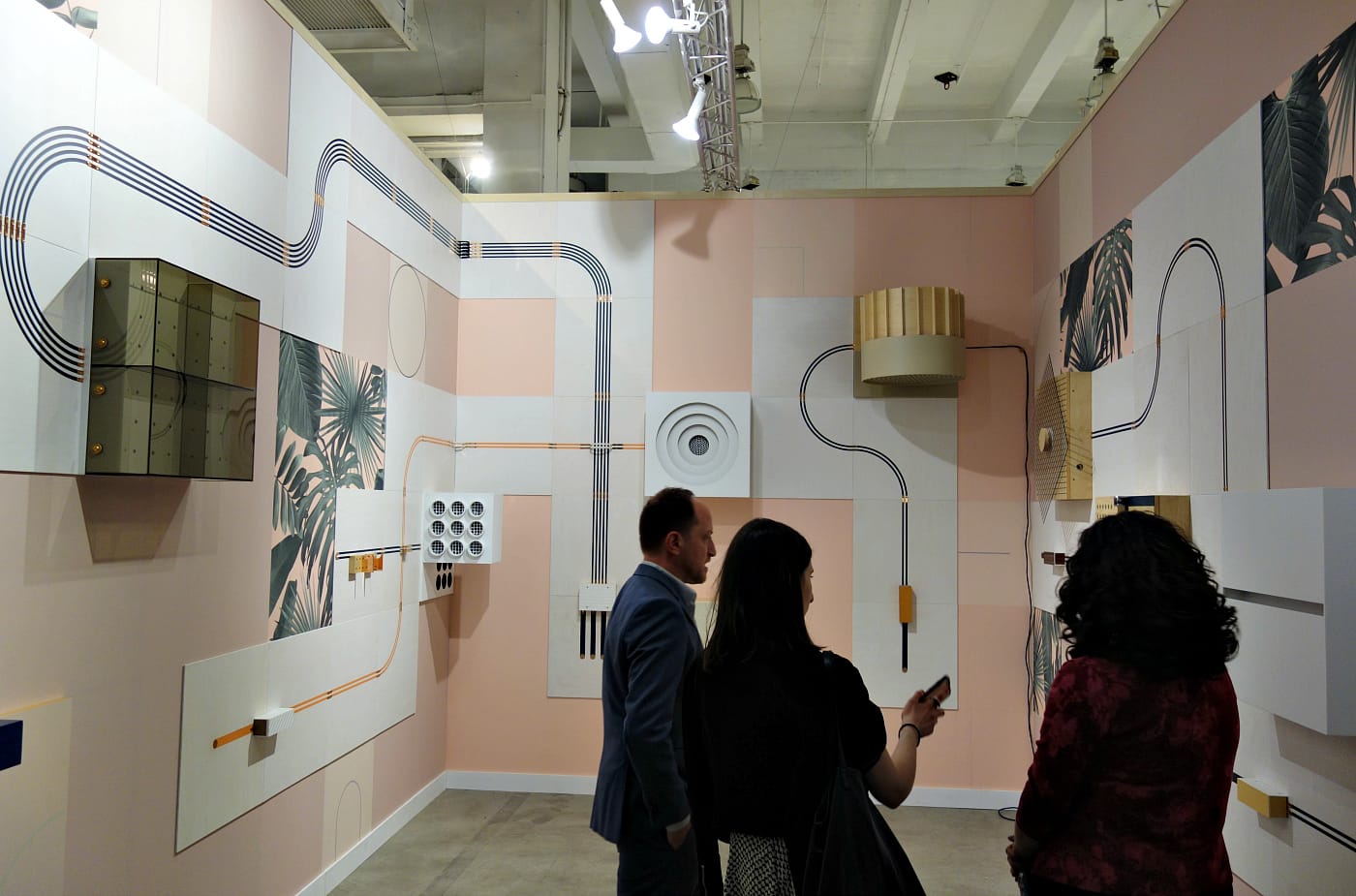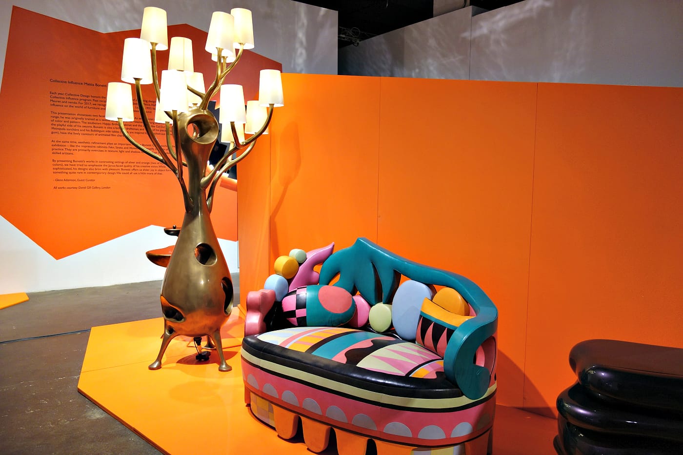 More erratic breadedEscalope creations are on view with Frederieke Taylor Gallery of New York. While they’re certainly the most interactive pieces at this year’s Collective Design (although you might be tempted to collapse on one of the Haas Brothers’ hairy-creature-like couches at R & Company), there’s much for fairgoers to discover. The playful work of Swiss designer Matti Bonetti is featured in the mini Collective Influence exhibition. Flavor Paper and UM Project are presenting touch-activated conductive ink wallpaper that illuminates lights and activates fans. Hidden in an industrial corner of the space, the Noguchi Museum’s installation mixes work by its namesake with undulating sofas by Robert Stadler. Below are more photographs from the fair’s assembly of objects by both local and international designers and artists.
