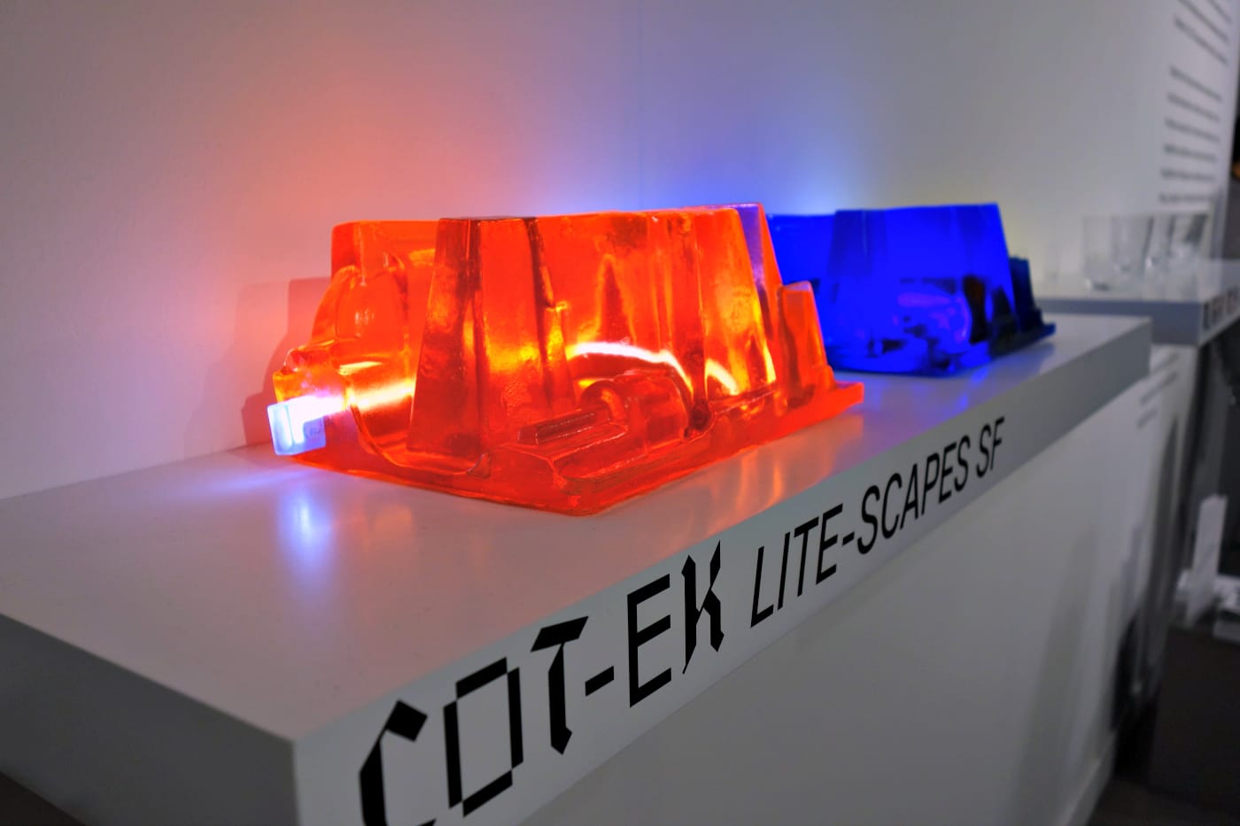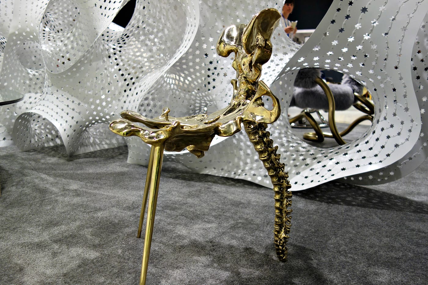 Overlooking the sleek booths of the main showroom is a dimly illuminated space where a curious white orb rests on the floor, surrounded by colorful concoctions in containers. If you time your visit right this week, you can witness the orb being pushed around by spectators and members of the Viennese design collective breadedEscalope, whose series of Original Stools are formed by filling a silicone mold within the sphere with resin and using motion to create a unique object.