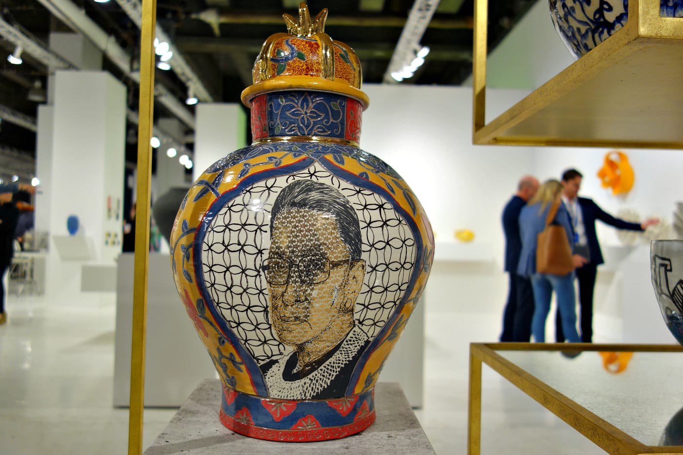 Porcelain urn by Roberto Lugo with Ruth Bader Ginsburg on one side and Geronimo on the other, on view with Wexler Gallery of Philadelphia