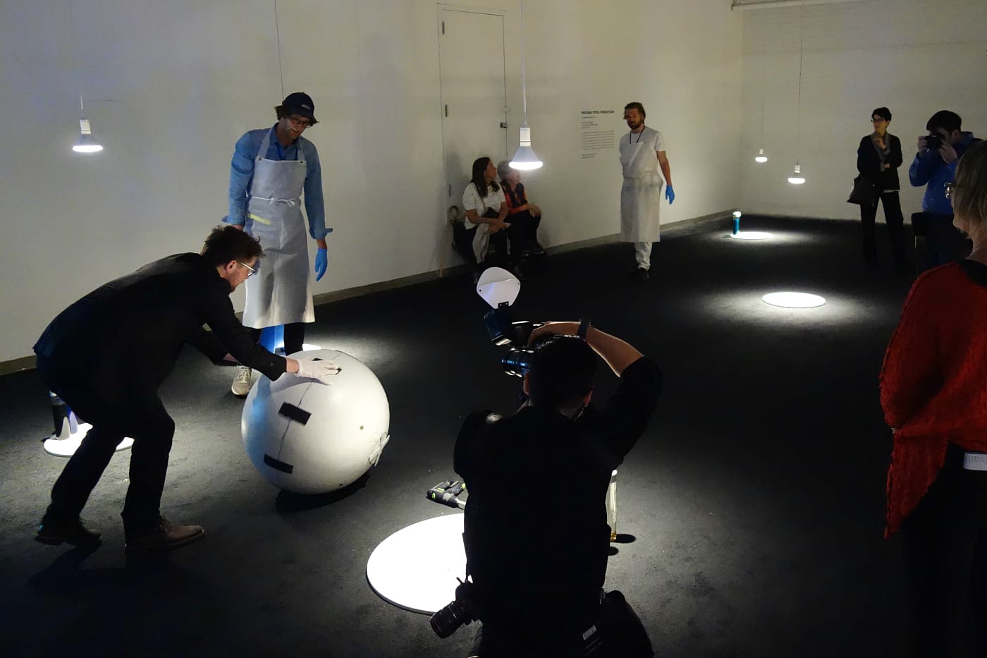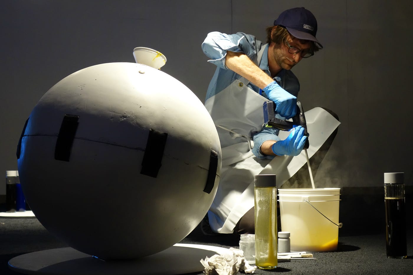 The Original Stools will be made from Wednesday to Saturday at the fair at 4:30pm, with a final event taking place on Sunday at 1:30pm. The first attempt, during the media preview on Tuesday, was rather tame, as journalists juggled their cameras and phones with Facebook livestreams while tentatively pushing the ball. “We should be more violent next time,” Schnabl commented upon seeing the yellow seat that emerged from the orb, only slightly misshapen. The resin was still warm to the touch, “like fresh bread,” he added.