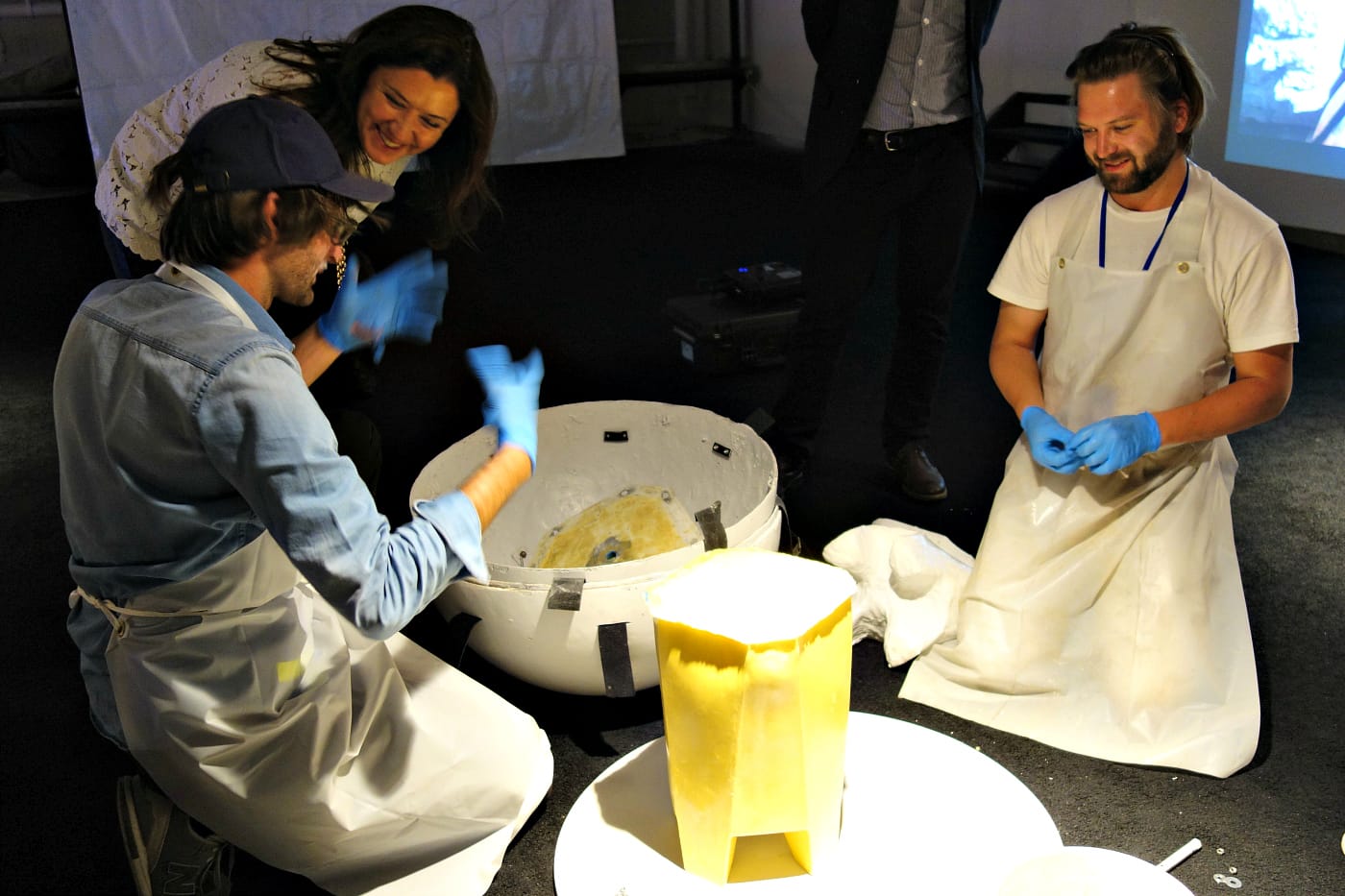 Participants rolling breadedEscalope’s orb to create an Original Stool at Collective Design