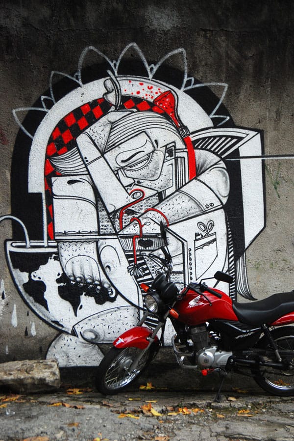 Graffiti in Rio de Janerio is some of the most festive, whimsical and lighthearted graffiti I’ve seen anywhere. Though the street art feels like it’s being taken seriously, the pervasive style is bold, playful, colorful, and full of bizarre scenes, stylized characters and undecipherable situations.
