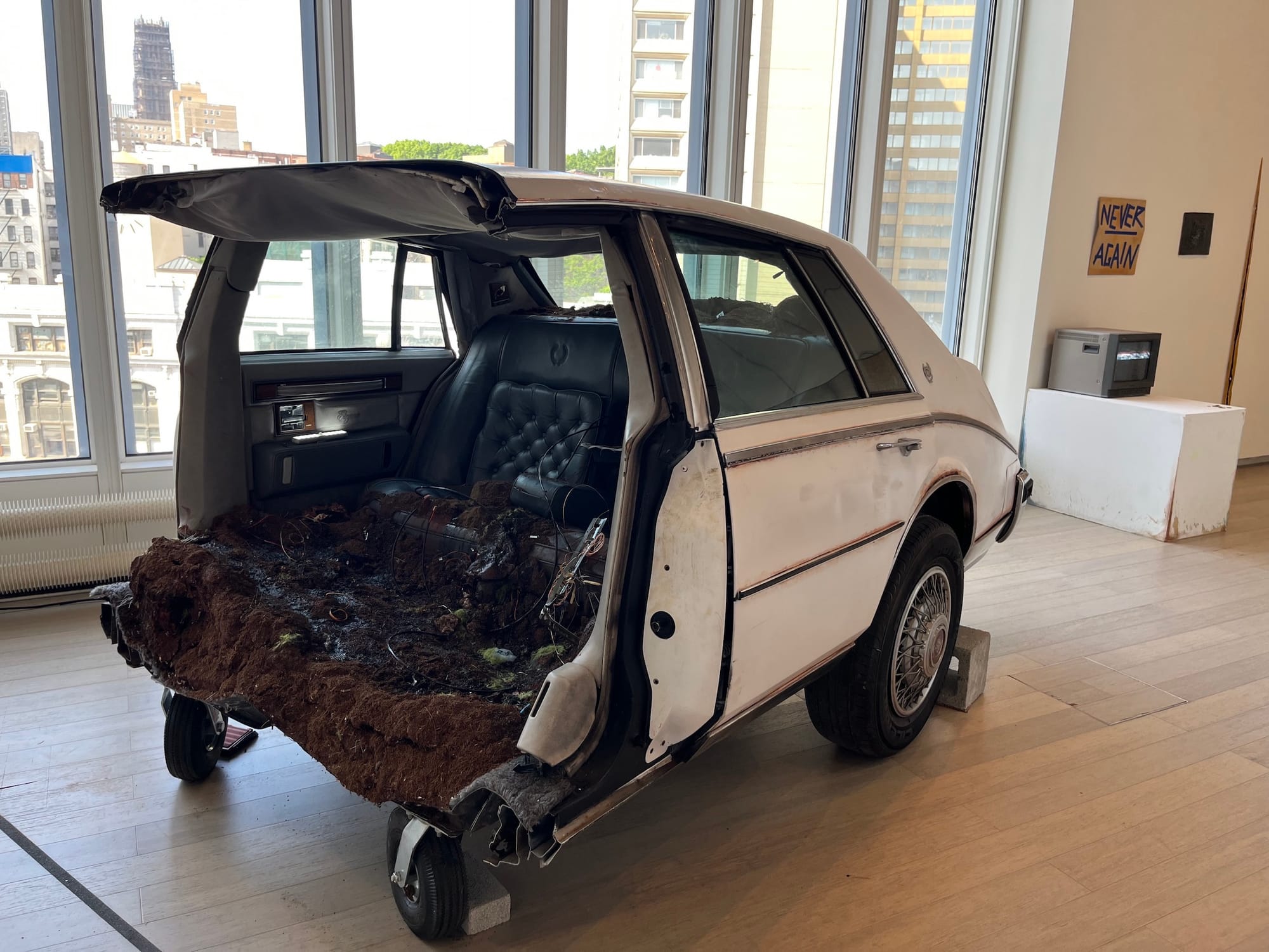 Two floors below, Alison Nguyen has summoned a horrific halved car filled with dirt. A disturbing film that follows the lives of three women programmed by artificial intelligence whose memories have been erased, interspersed with references to the Vietnam War, plays across three nearby screens. In one scene, the women sit in the back of a car with a dead man lying in a pile of dirt at their feet.