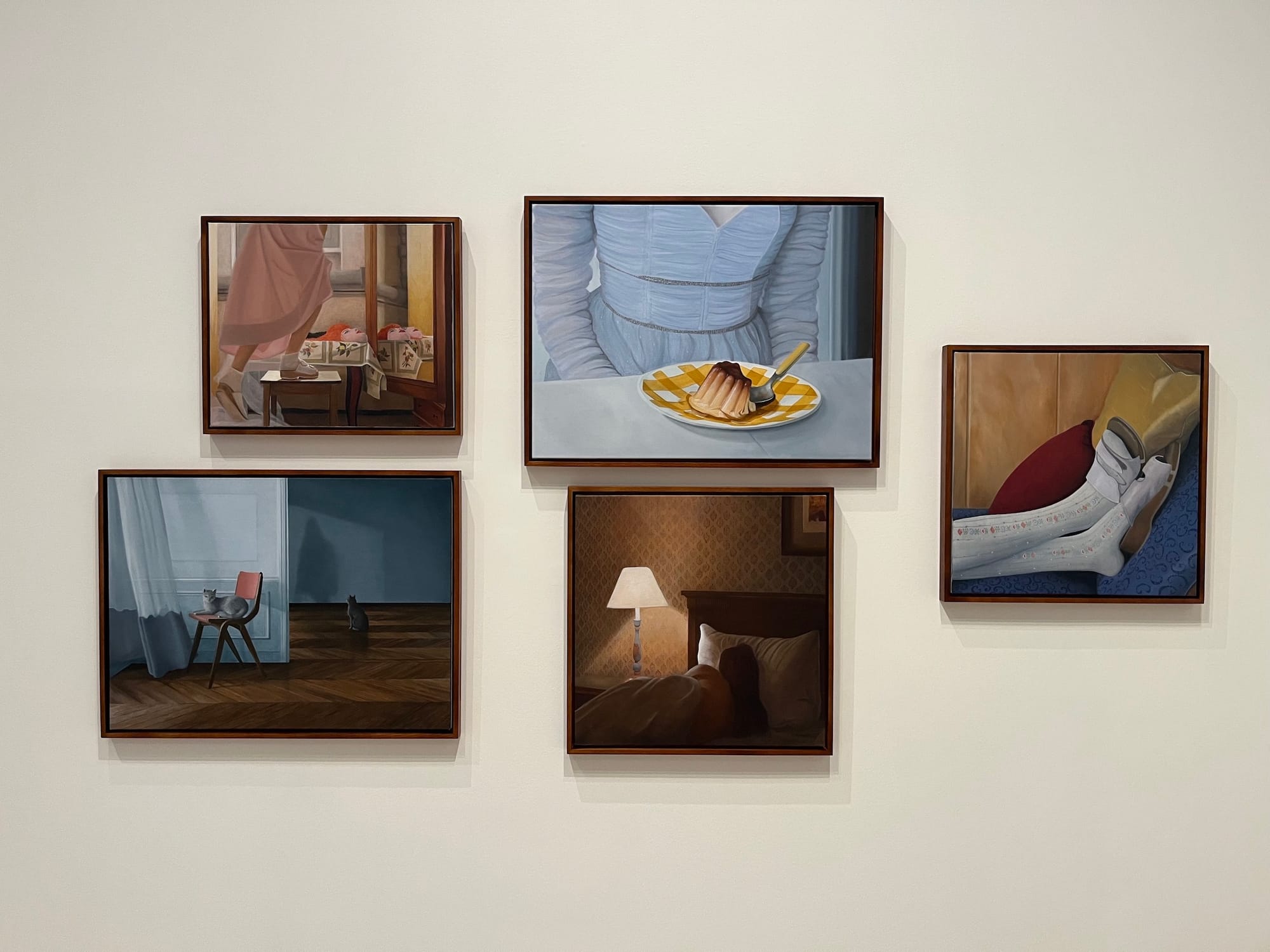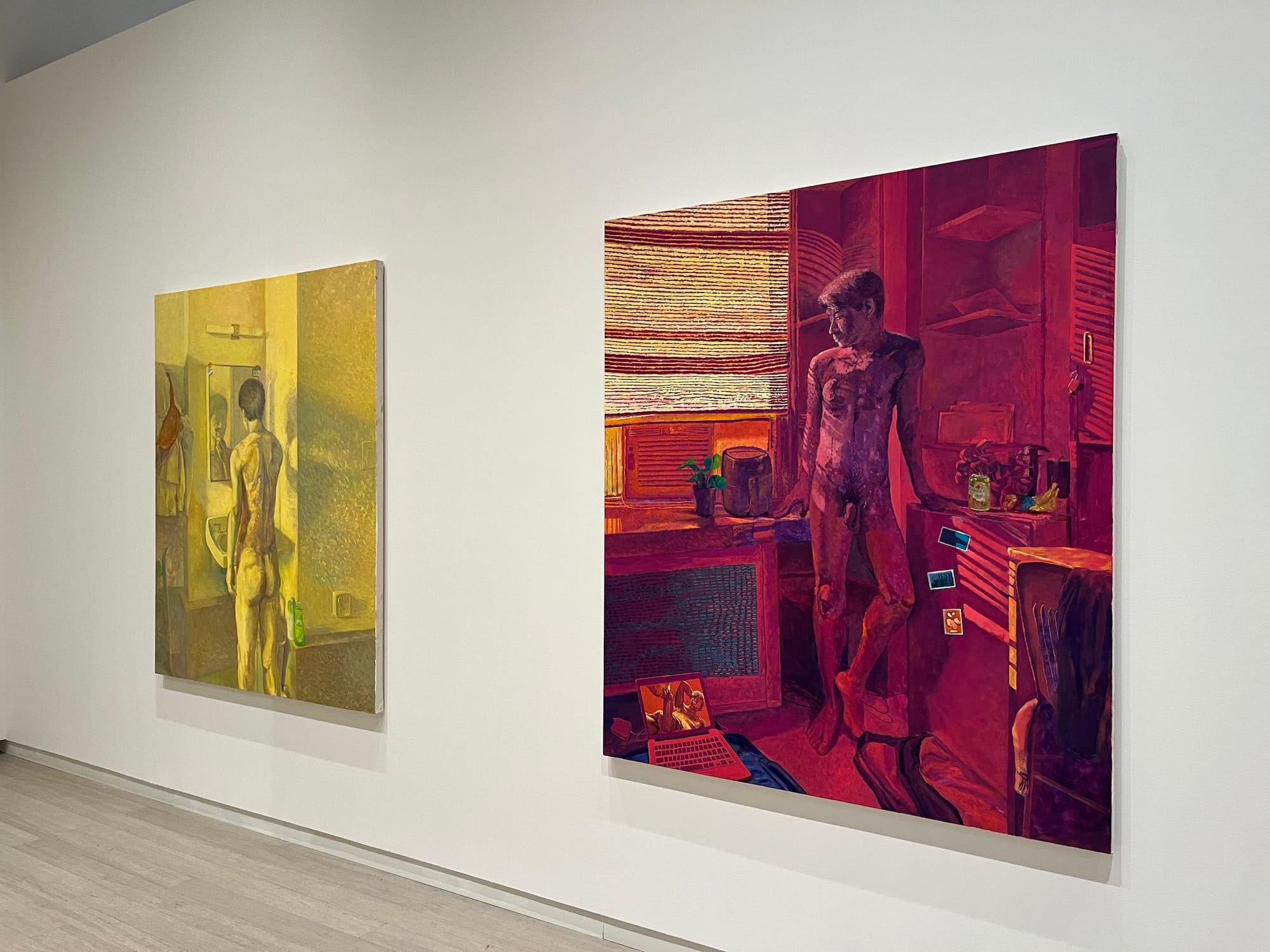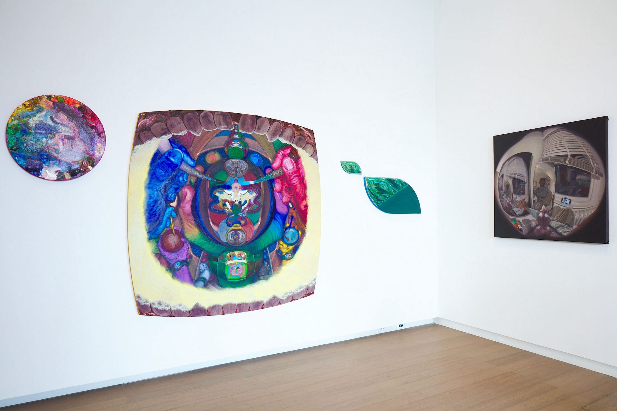 Downstairs, Li Wang's paintings show a single naked subject in various domestic spaces drenched in vibrant lighting. Kat Lowish created a series of paintings depicting interiors, too. They are mostly quiet and occasionally surreal, asking what goes on in our most intimate environments when no one is there to watch. Kevin Cobb's series of strangely shaped oil paintings play with perspective and self-perception, piling multiple realities of vision into single works and depicting the view of the artist while they are physically creating the artworks.