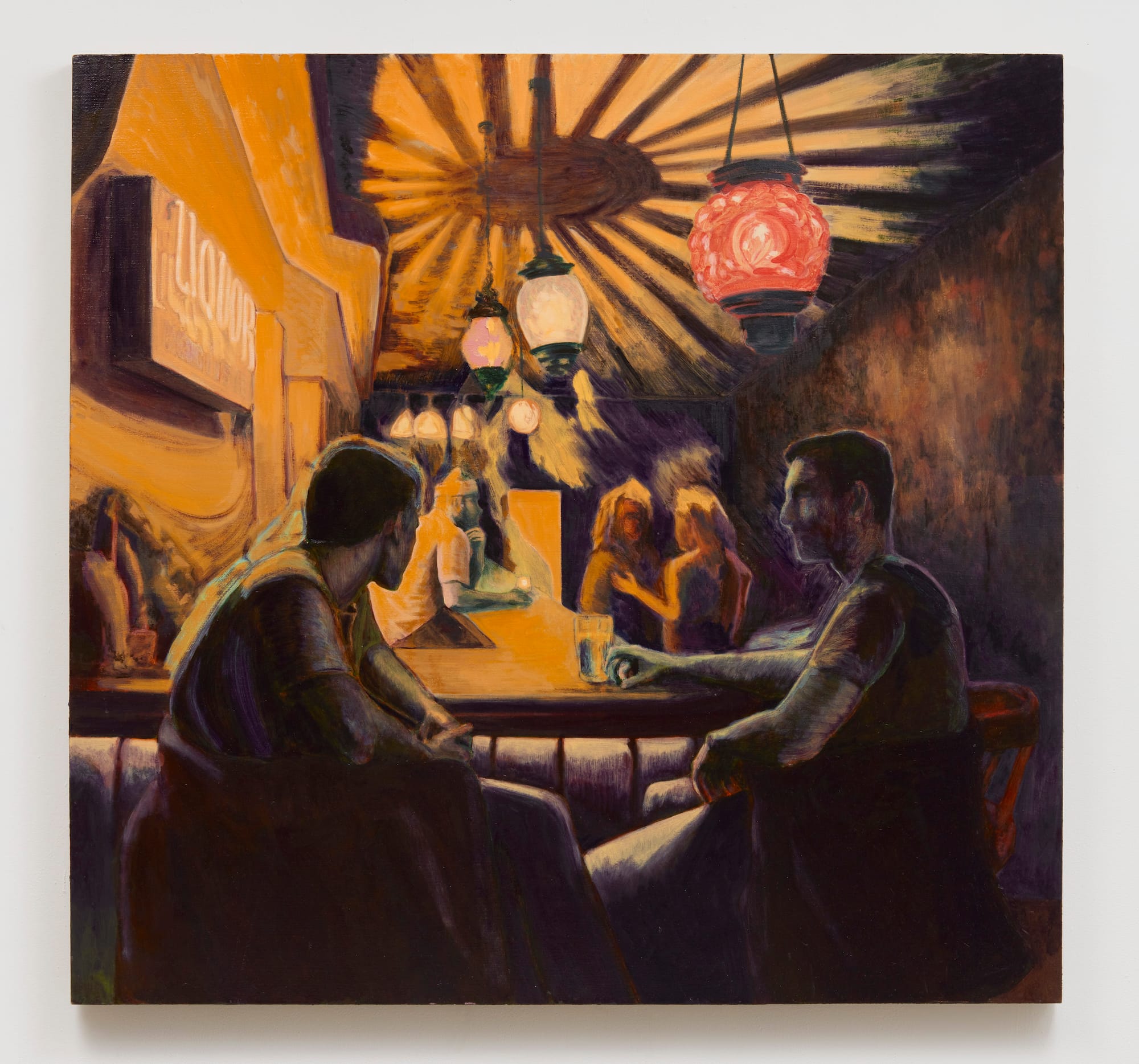 The Columbia MFA exhibition also includes a smattering of exquisite paintings, some contemplating collective histories and others relaying deeply personal moments. Conor Dowdle's "Duo Divorce Club" (2022) depicts a Brooklyn bar. Dowdle, who sketched on site, told me the characters sitting on the bar stools loosely resemble real people. The bar almost looks like a carnival, with its yellow hues and ceiling painted with the sun-ray pattern of a circus tent. The figures themselves appear transitory, too, loosely outlined and blurred as if in motion.