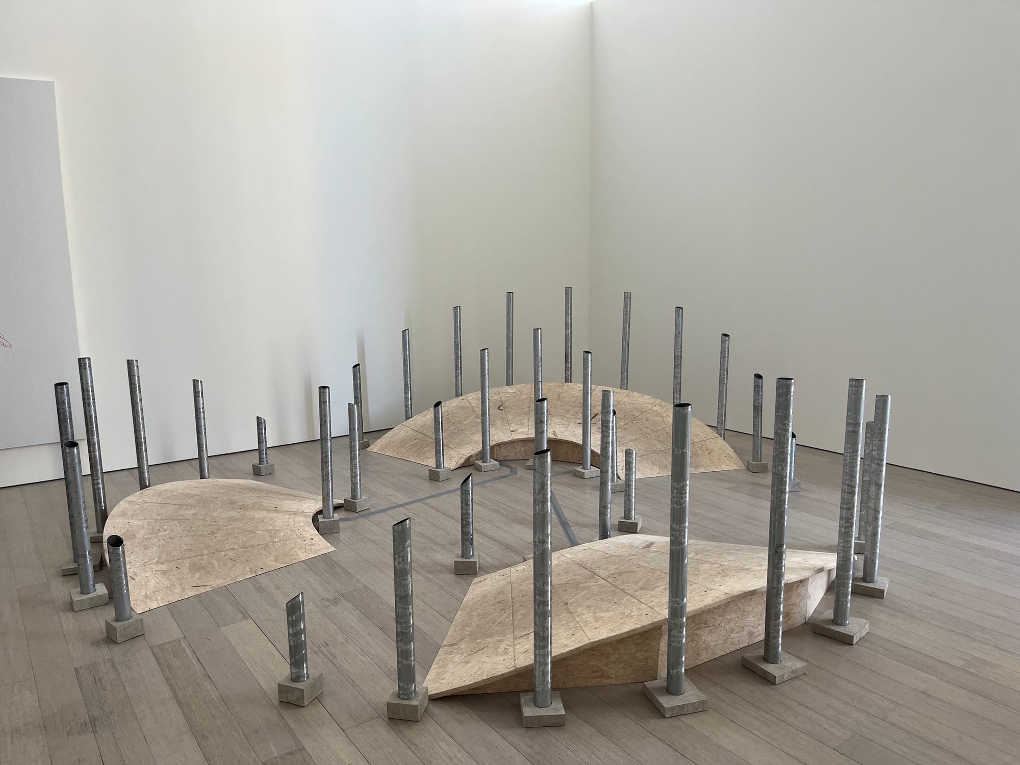 Other works are more playful. Merry Sun's "Wayward Bridge, Westward Sun" (2023) encompasses three sloped platforms with steel pipes lined up along their sides. The pipes play whimsical notes as the viewer walks across the undulating bridges.