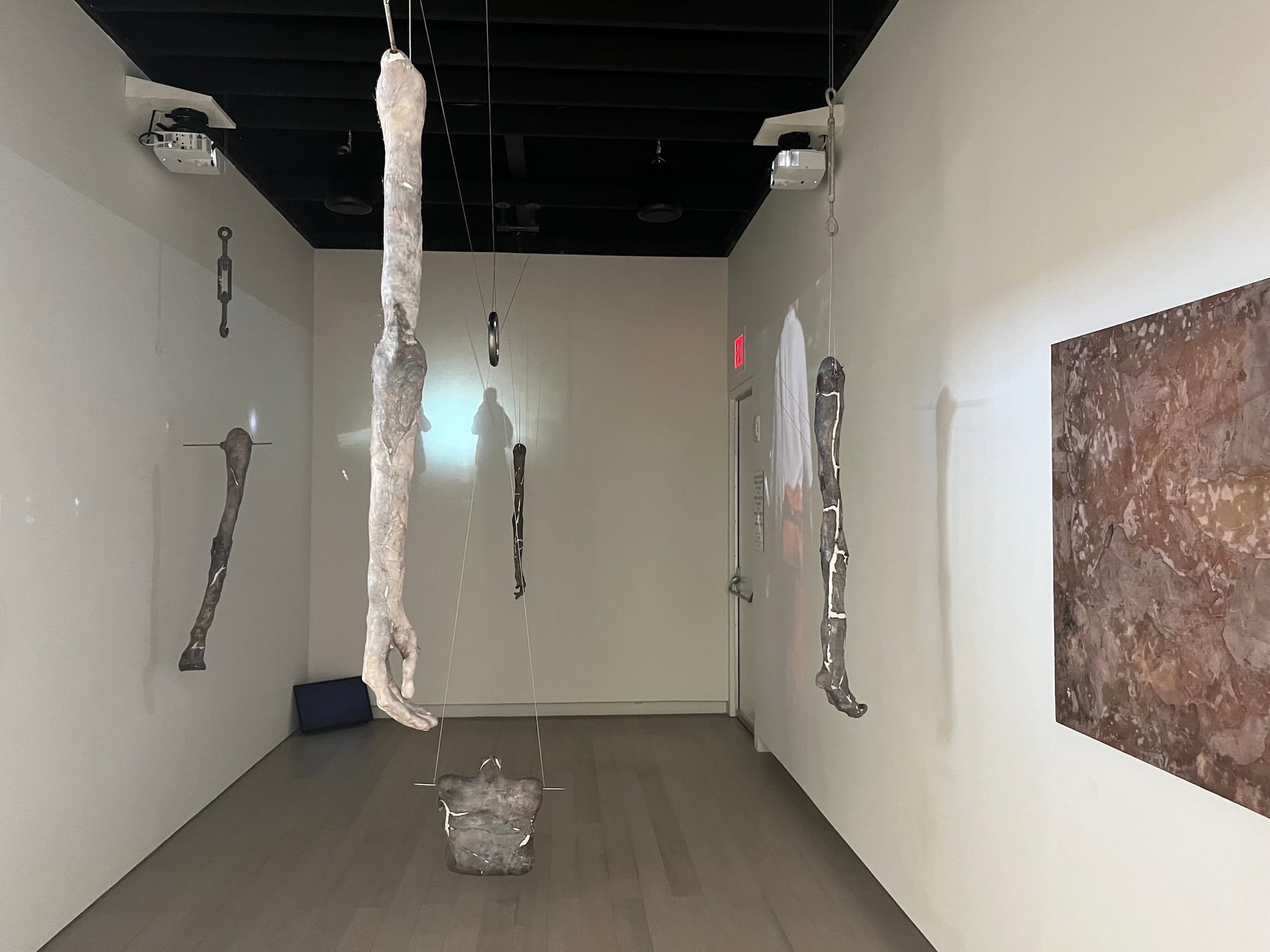 One thing that stands out about the show is a handful of artists' exploration of fear as a tool to convey a deeper meaning. On the upper level, Anna Ting Möller's two-pronged installation comprises severed limbs hanging from the dark space's ceiling and a 10-minute video loop. The film blends personal and landscape imagery taken in China (Möller is Chinese and Swedish). The scenes — glimpses of a water bottle resting on a table, the facade of an apartment building, a crowded street, a serene river, and fidgety hands — evoke a racing memory. In front of the video, Möller's sculptural works are made in part using kombucha culture. The probiotic is made from tea and sugar, two drivers of imperialism, and Möller describes her use of the material as a reflection on colonial histories.