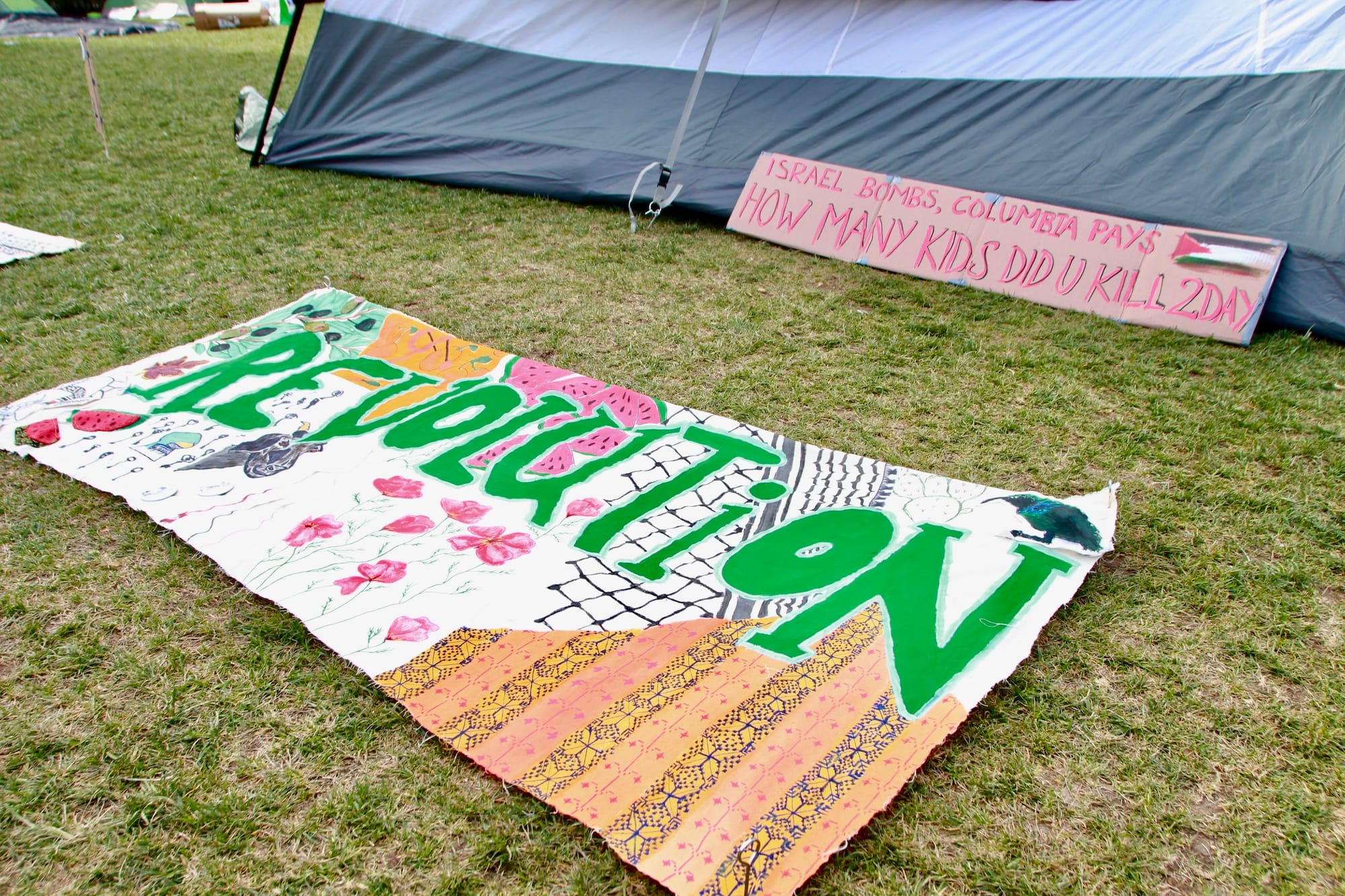 Protest art decorated the lawn around the green tents as students chanted and sang. Dozens of demonstrators were arrested on Thursday, April 18, after hundreds of students remained on campus overnight and NYPD was called in to clear the encampment in a highly criticized move by President Nemat (Minouche) Shafik.