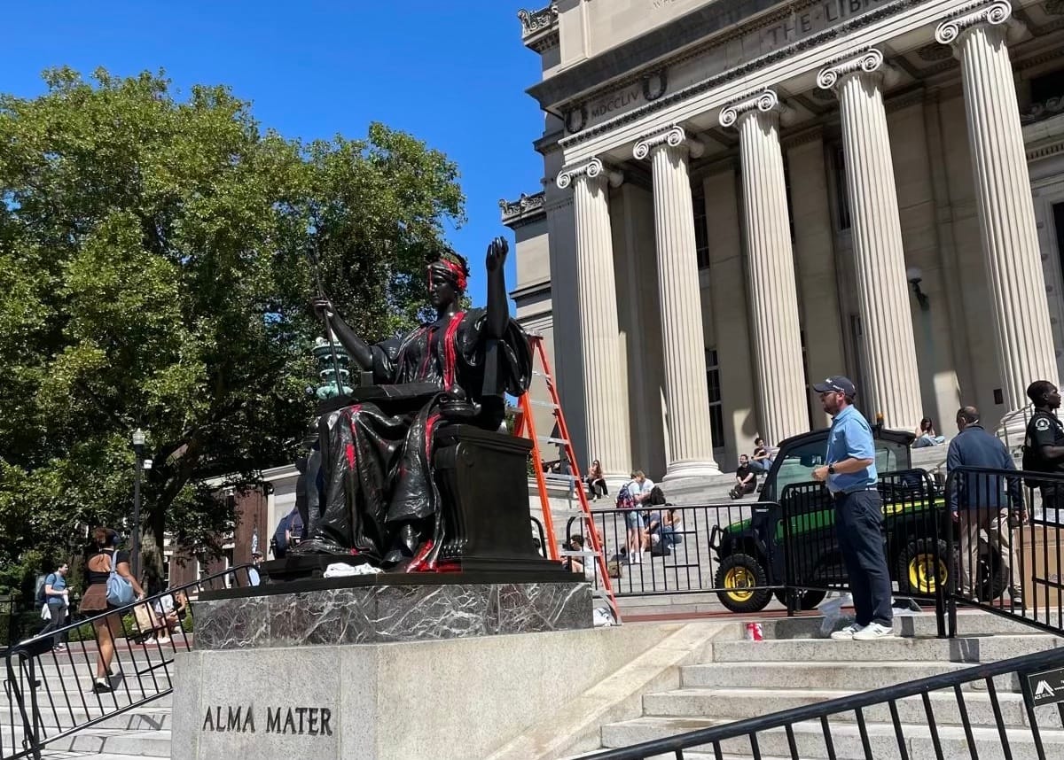 Unidentified protesters poured red paint over the bust of the famous “Alma Mater” (1903) statue on Columbia University’s Manhattan campus on the first day of classes, Tuesday, September 3. The apparent protest action comes after the group named Columbia University Apartheid Divest (CUAD) called on students to “shut it down,” noting that “Gazan students have no universities left to which they can return.”