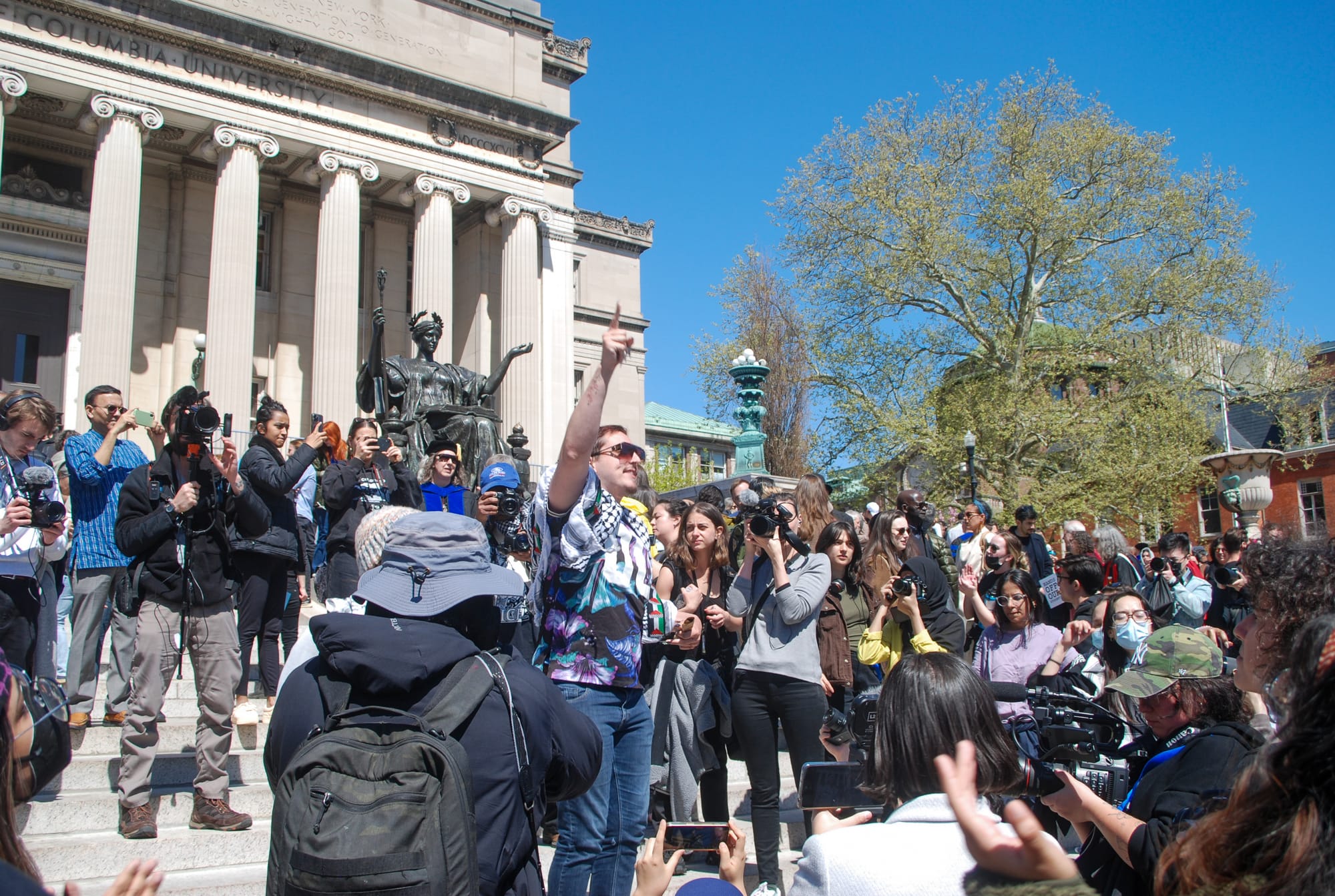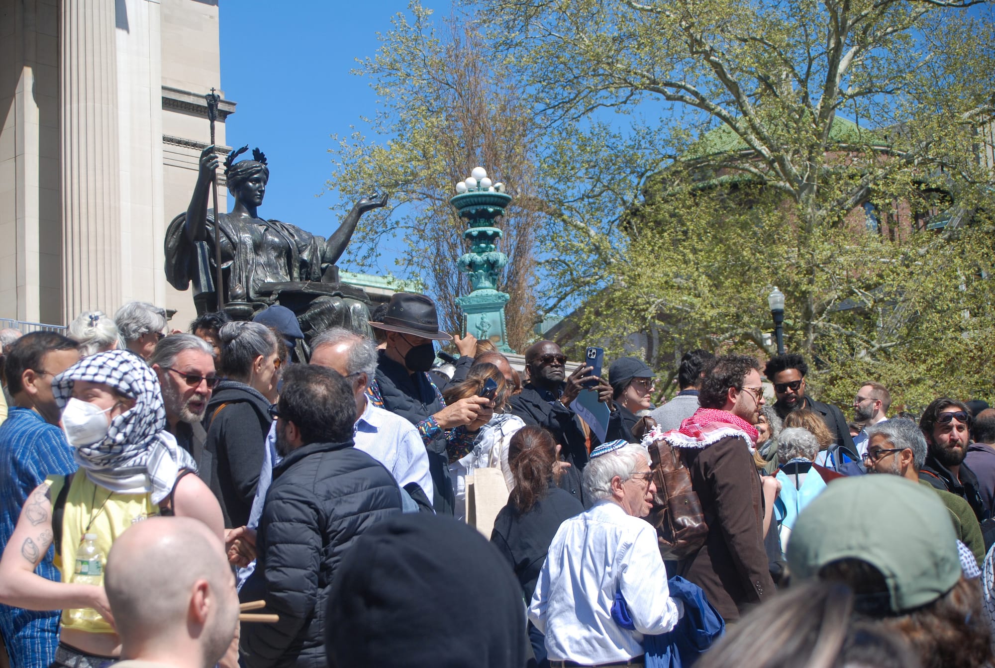 After Hamas’s October 7 attack and Israel’s ongoing assault on Gaza, however, the statue took on a new significance. In its central location on campus, “Alma Mater” was the site of several historical moments during April’s student protests leading up to the raid of Hamilton Hall by hundreds of New York Police Department officers.