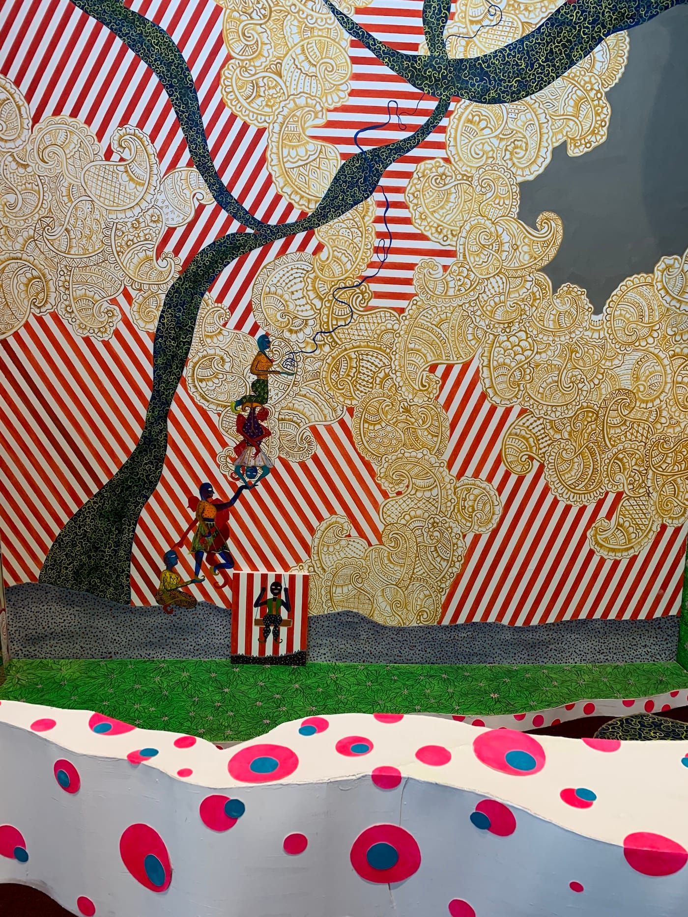 There are others who follow this path. The daughter of immigrant parents from India and Pakistan, Ruhee Maknojia’s work searches for symbols of paradise and peace through Persian philosophy and other sources. “The Garden” (2019) is an installation made for relaxation and yet it’s constantly being invaded by trouble. Mischievous characters and chaotic patterns cover the work, weaving a pathway for the viewer into the installation’s darker inner sanctum of meditation.