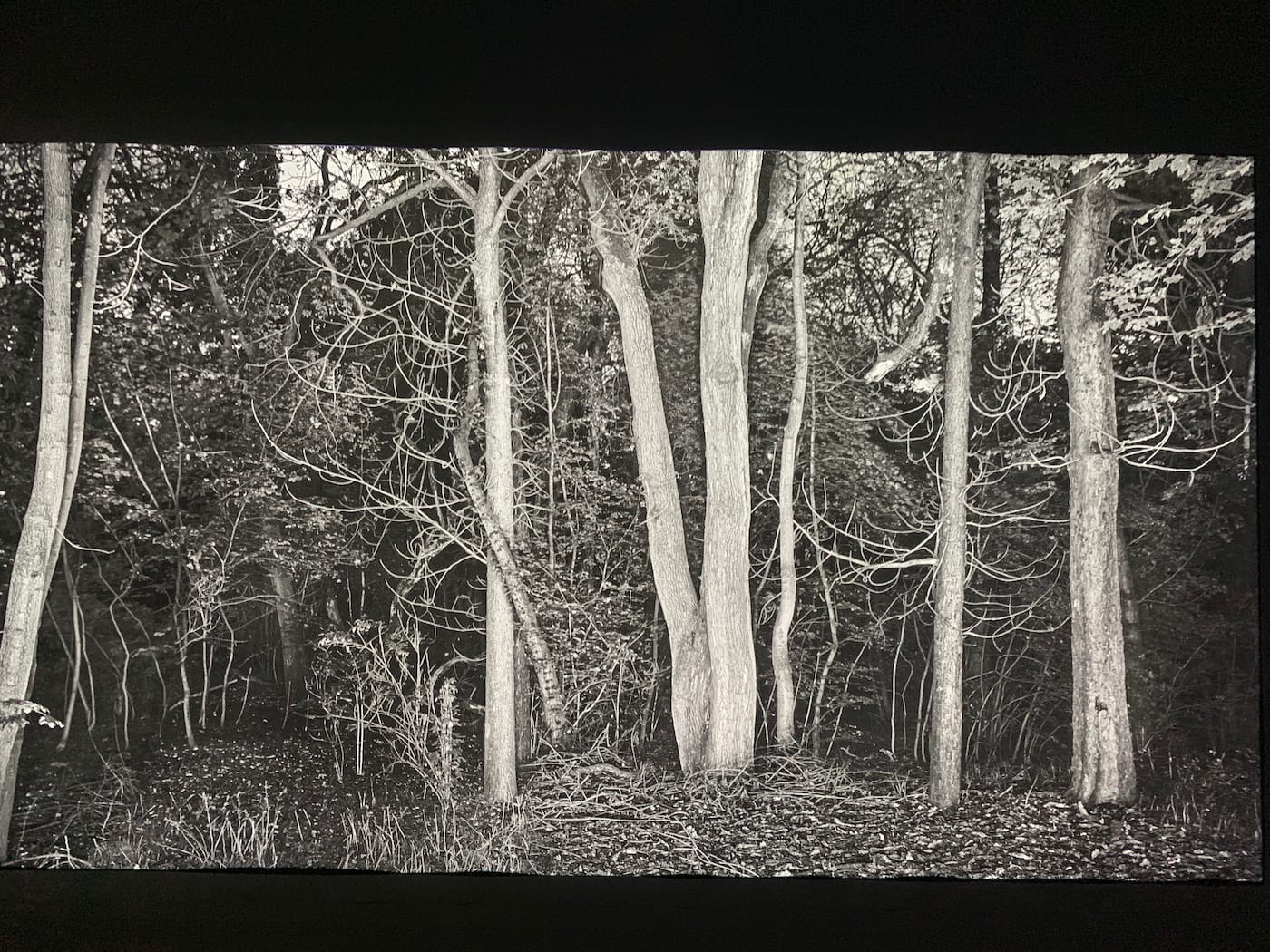 Fear flashes from the dense woods seen in Taejoong Kim’s Foresta series (2019). Like a scene from a horror film, images of the forest burst onto the projection screen with alarming pace. Many of these images or granular in detail and flat, almost like a woodblock print. Anxiety fills the room. Is that the sound of crunching leaves and branches? Plot twist. On the other side of the screen, viewers will notice that the artist has poked several pinholes into the fabric, which creates a serene vision of twinkling stars on the opposite wall.