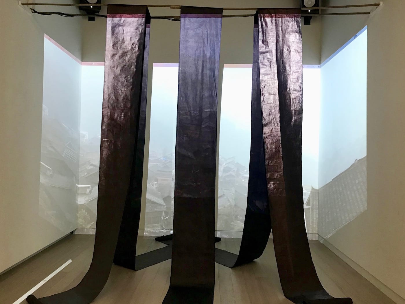 Lemon Guo’s “Loom” is a beautifully haunting audiovisual installation that presents long sheets of fabric with video of a Chinese landscape projected onto them. A din of whispers fills the room as a narrator describes life in the village we see projected on the walls. Her voice grows louder and polyphonous while describing the very sounds she hears in the village. The volume grows until all that’s heard is the hard “S” of her consonants.