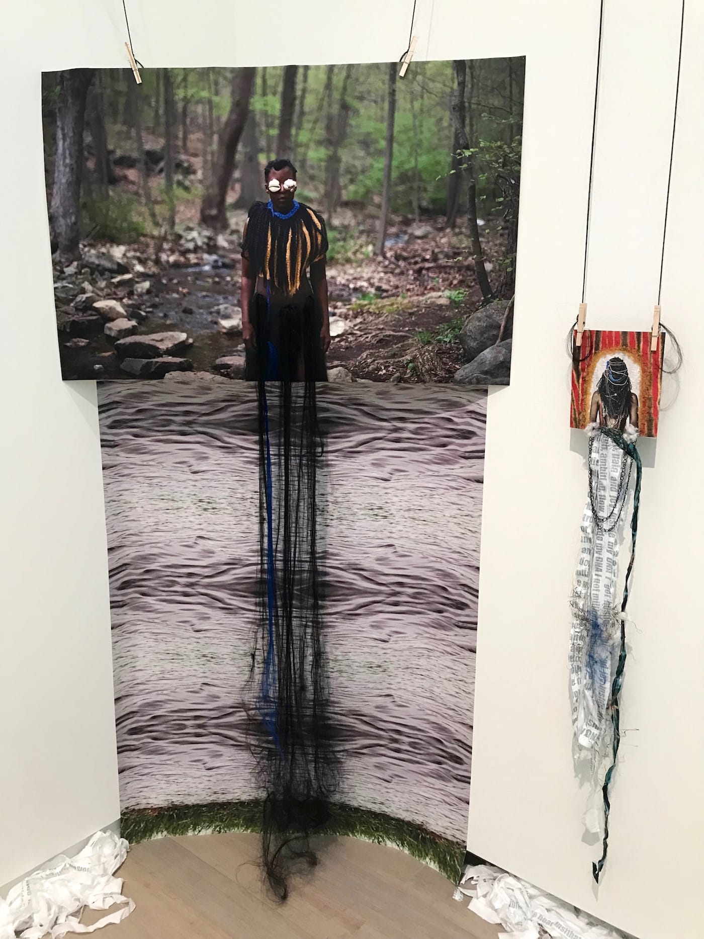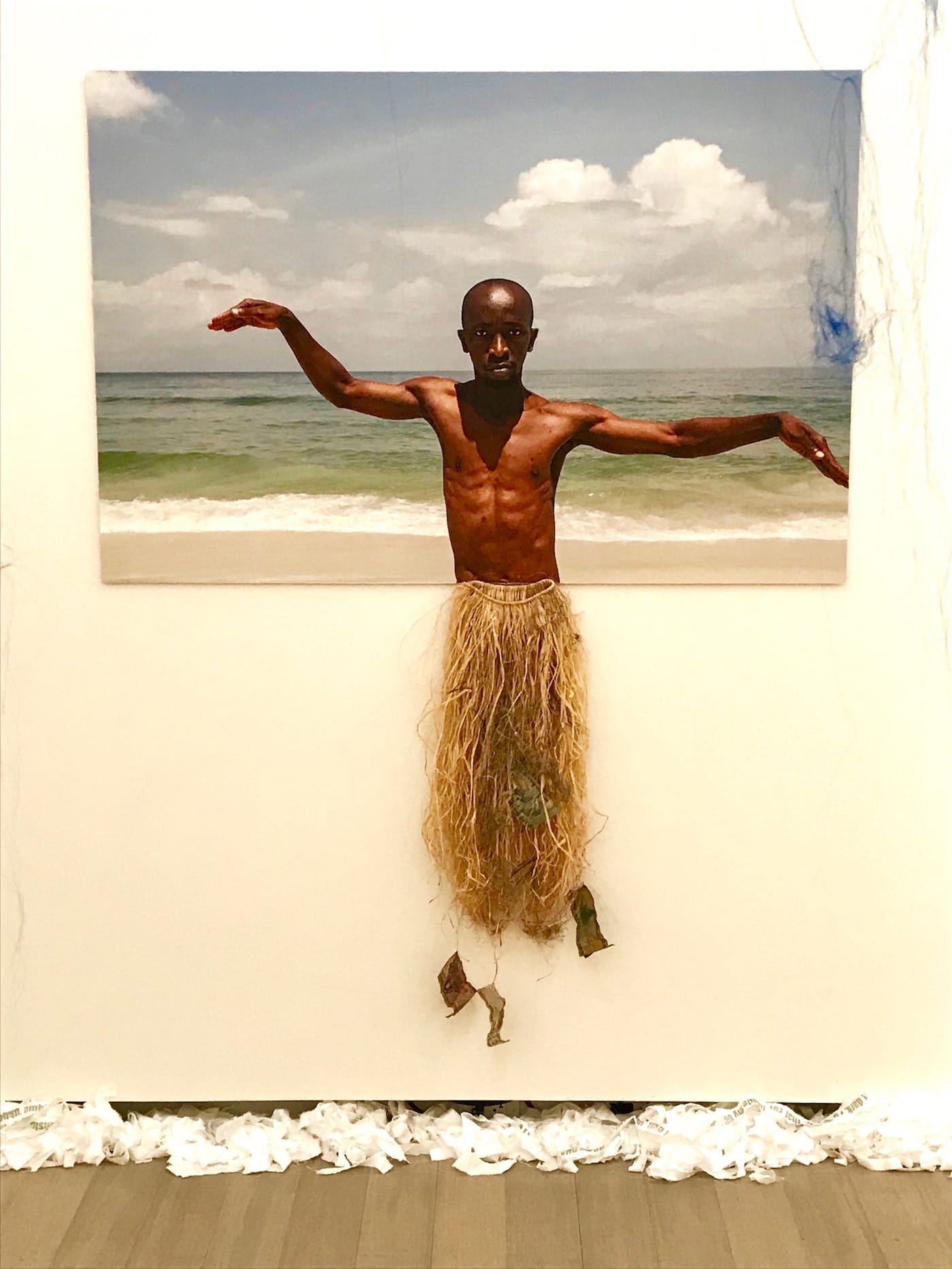 On the opposite side of the gallery is an equally haunting installation by Delphine Adama Fawundu. The Broooklyn-born artist advances a postcolonial critique that assembles work according to the conditions of black identity politics, spirituality, and gender. In many of her works, Fawundu splits her subjects’ bodies in two. “Earth Seed” (2018) depicts a man — with cowry shells covering his eyes — whose legs have been turned into long strands of black hair. In “Olokun” (2017), another man’s lower half appears to consist solely of a grass skirt.