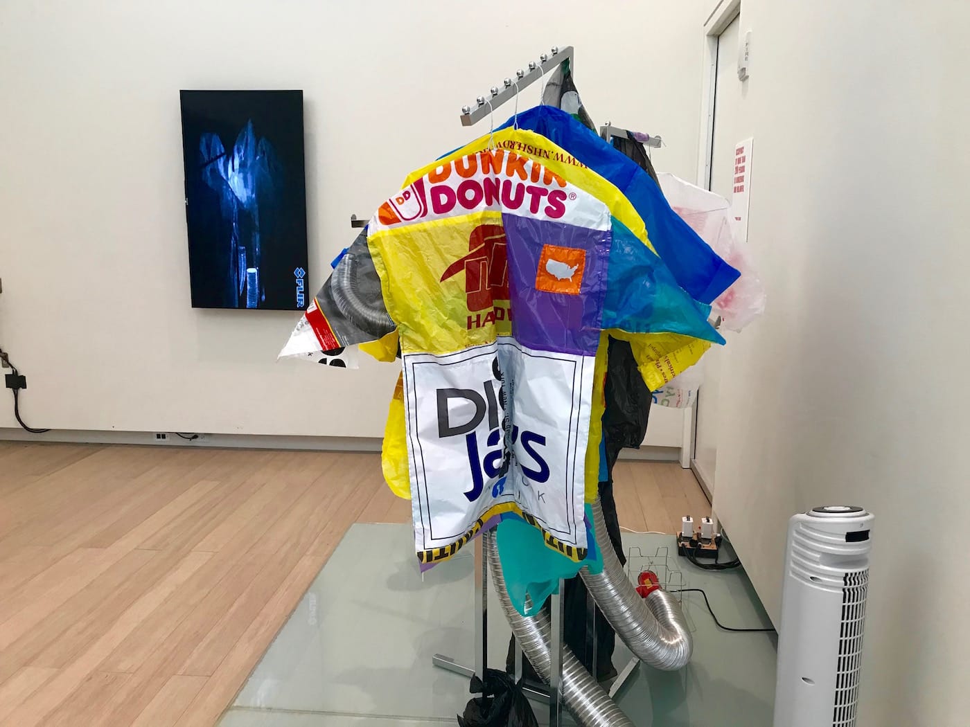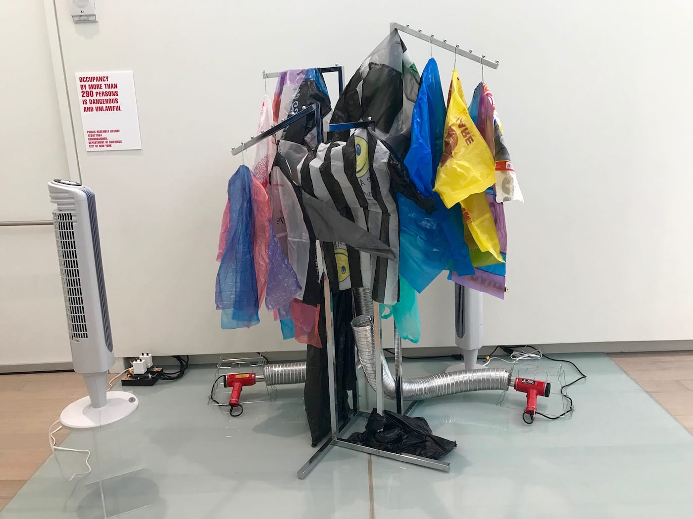 Asif Mian’s rack of plastic couture, titled “Nothing & Specter” (2018), also made a strong impact. It operates in tandem with two video pieces featuring footage shot on thermal cameras. One is a live feed of “Nothing & Specter,” which periodically inflates and deflates; the other is a recorded performance titled “Breath Ascent Reveal” (2018). Together, these three works form a triptych that seems to comment on the invisibility of minority suffering within a consumer society. The image of Eric Garner saying “I can’t breath” immediately comes to mind when viewing the installation, an ominous contrast to how much the live thermal video of “Nothing & Specter” resembles the silhouette of a Ku Klux Klan member’s costume.