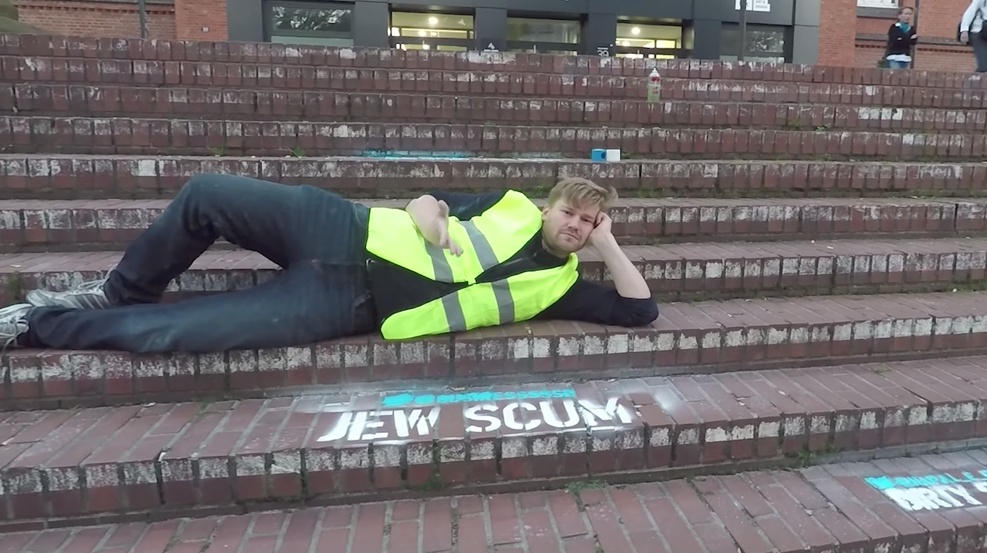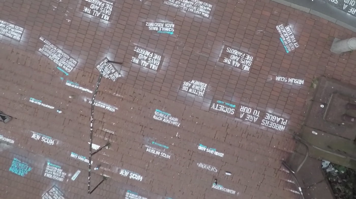Shahak Shapira, a Berlin-based Jewish comedian and author, has stenciled and spray-painted 30 racist, Islamophobic, anti-Semitic, and homophobic tweets — and the accounts associated with them — outside Twitter’s German headquarters in Hamburg. The action is part of Shapira’s #HEYTWITTER campaign, a response to Twitter’s choice to not remove such comments from their platform.