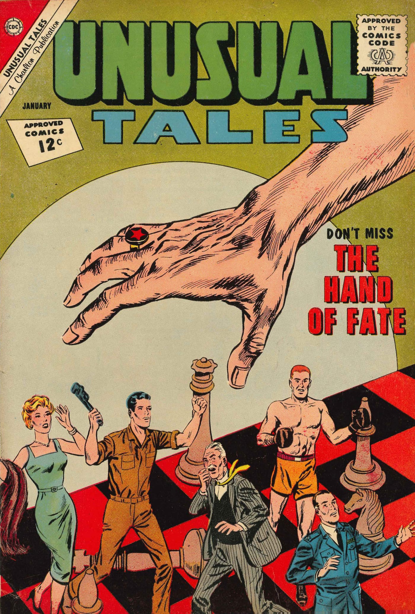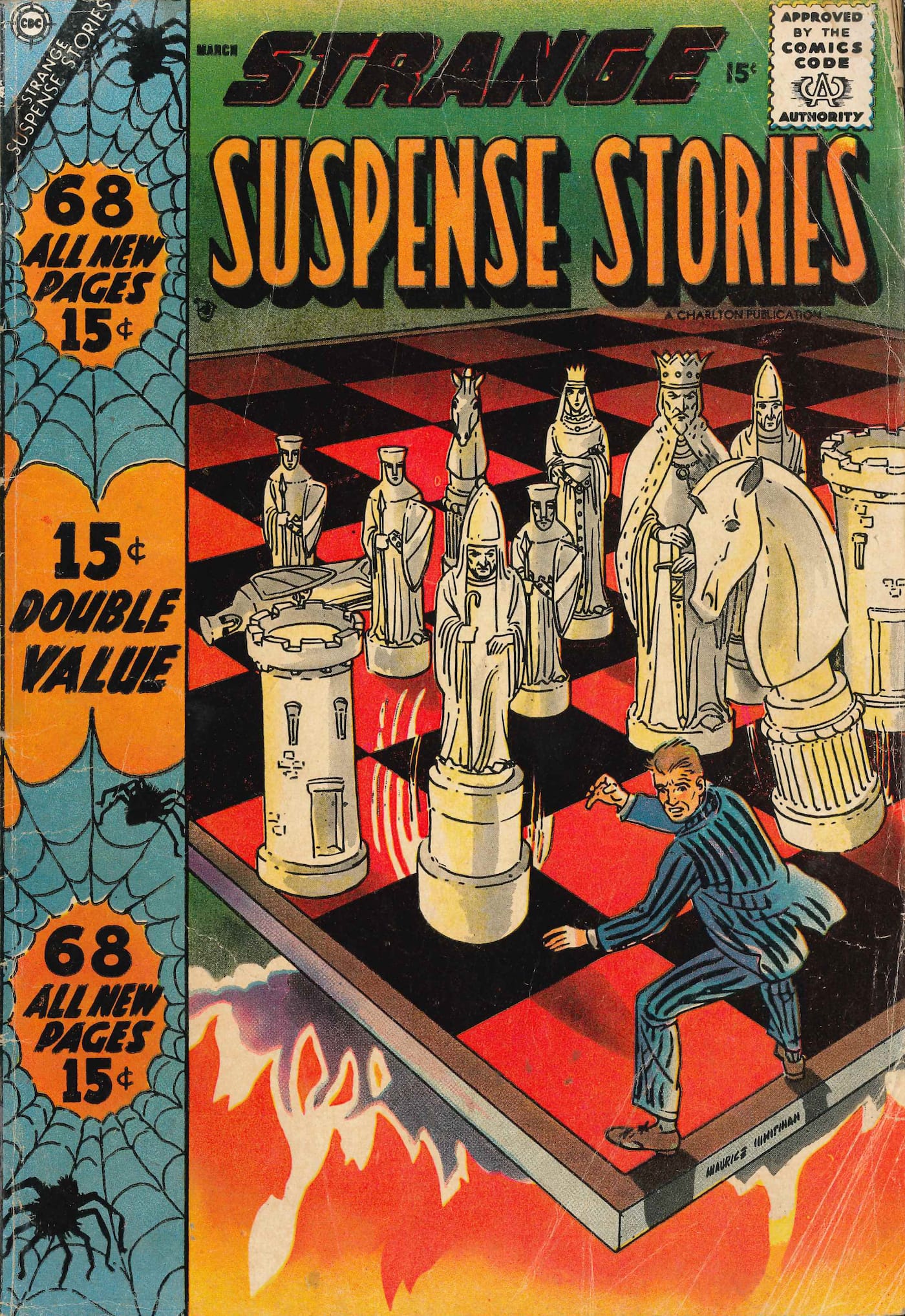 Sometimes very literally, with numerous covers showing characters being controlled as chess pieces on a giant board. In a 1980 Marvel comic, the Hulk is pummeled by colorful robots on a gridded floor, the text “CHECKMATE!” in red all-caps letters; the 1960s series Strange Tales: Nick Fury, Agent of S.H.I.E.L.D., illustrated by Jim Steranko, featured the villain Prime Mover, a chess-playing robot concocted by Doctor Doom. The DC Comics series Checkmate, which started in 1988, focused on a covert operation team whose hierarchy was based on chess pieces. For some comic artists, there was a personal connection to the game. In an accompanying exhibition essay, author Michael Tisserand notes that “one of the country’s first editorial cartoons, a severed snake with the title ‘Join, Or Die’ (published in 1754), was drawn by the founding father and chess enthusiast Benjamin Franklin,” while C. W. Kahles, who created the early 1900s comic Hairbreadth Harry, decorated the walls of the Brooklyn Chess Club, of which he was president, with his art.