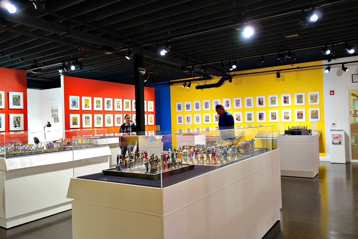 Bailey organized POW! Capturing Superheroes, Chess & Comics now at WCHOF, a nonprofit institution that explores the connections between art and chess in its programming. Founded in 1986 by the United States Chess Federation, WCHCOF opened in St. Louis’s Central West End neighborhood in 2011, following the closure of its Miami museum in 2009. Recent exhibitions range from Designing Chessmen on the imagery of chess, to chess during World War II and the games designs of Michael Graves. WCHCOF is active as a collecting institution, and since POW! opened in March, collectors Floyd and Bernice Sarisohn — whose memorabilia and ephemera form the foundation of the exhibition — have decided to donate their comic books and related sets.