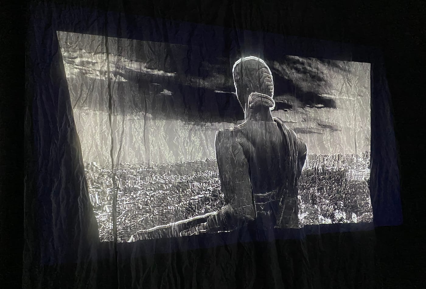 Three additional installations set in small rooms off the main space offer accompanying perspectives on the war and its aftermath. “Bunker” is a stark, black-and-white projection adapted from drone footage of Armenian landscapes by Khachatourian and Liam Hise. Recognizable forms pop out from the high-contrast processed video — monasteries, a statue, animals grazing on a hillside — all devoid of human life.