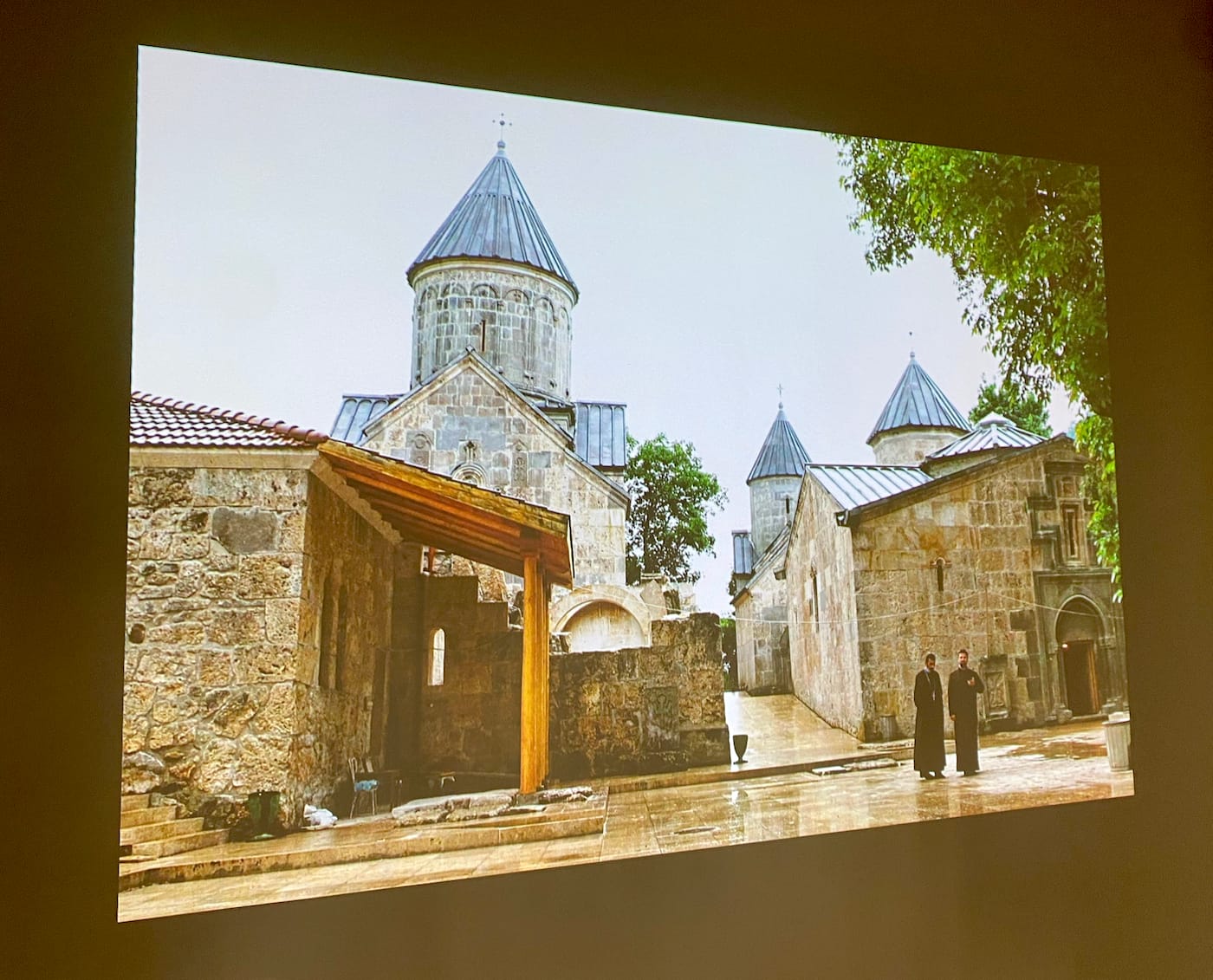 Next door, color and people return in “Revive,” a slideshow of over 100 photographs taken by She Loves artists Mari Mansourian, Rouzanna Berberian, and Nairi Bandari on their trips to Armenia earlier this year. In contrast to the bleak portrayals of a war-torn region typically shown in the media, these images paint a composite portrait of everyday life that continues despite the disruptions of war. According to Baghdassarian, more photos will be added to the slideshow throughout the exhibition, sourced from community members.