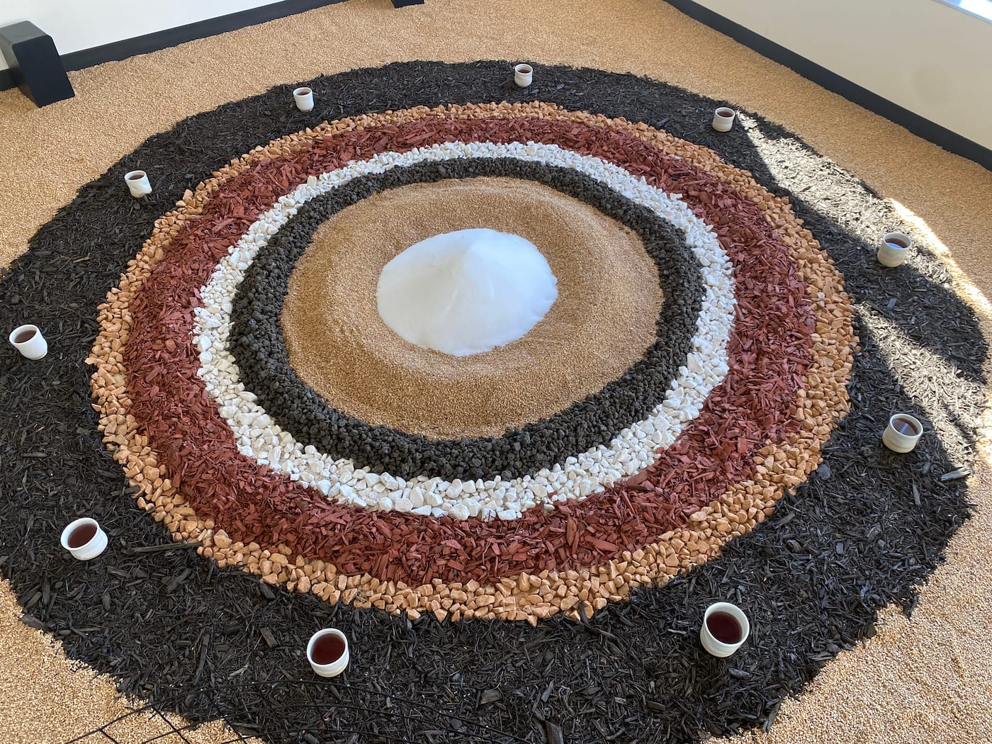 The final room is dedicated to the collective work “Ritual,” in which concentric rings of salt, marble, wheat, lava rock, and mulch are laid out on the floor, conjuring the healing properties of natural elements. Echoing the number of ribbons in the principal installation, 3,906 drops of pomegranate juice, measured out with an eye dropper, fill cups placed in a circle. “I always say no pomegranates,” says Baghdassarian half-jokingly, referring to the symbolic Armenian fruit. “But we made an exception.”