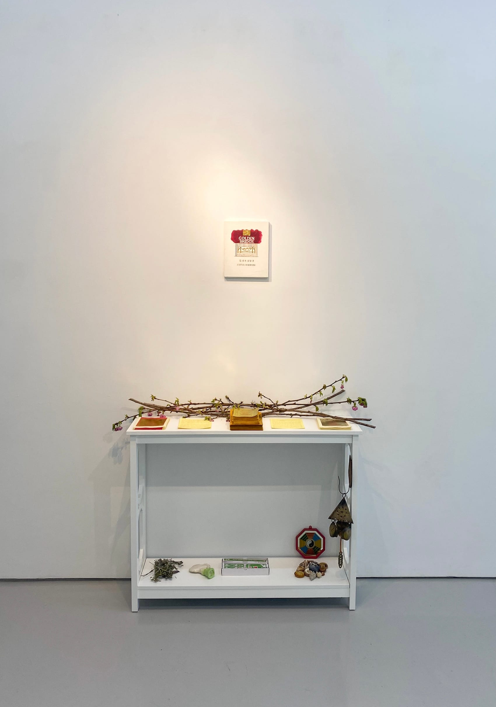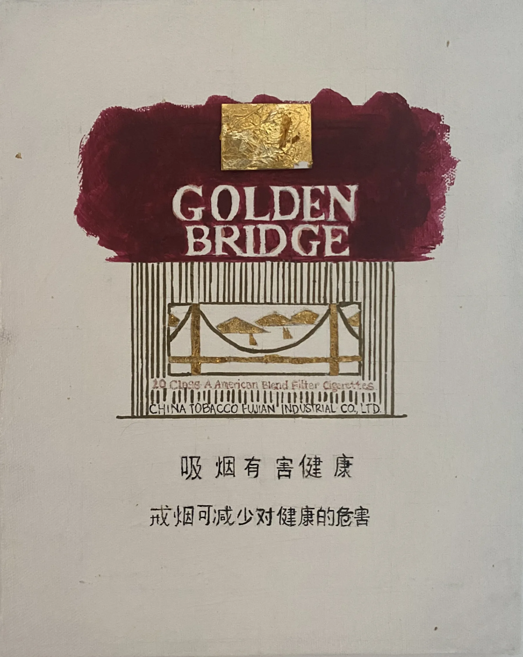 At the center of the altar is Christina’s own painting, made as a gift to Klein at the end of her tenure as the gallery’s assistant director. Rendered in acrylic and gold leaf, the painting depicts a box of Golden Bridge cigarettes, an inside joke that originated with Lee finding boxes of the cigarettes, Klein’s favorite brand, hidden in between art books.