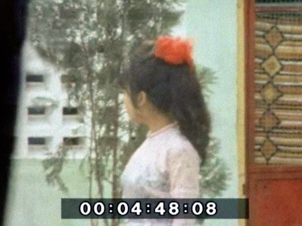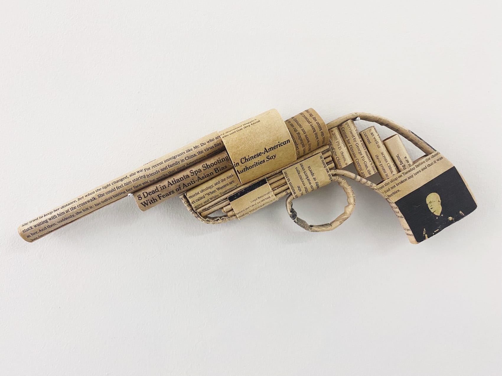 Despite Klein’s initial intentions to disentangle Lee’s legacy from the conditions of her death, the exhibition, which draws its name from Theresa Hak Kyung Cha’s poetry volume Dictee (1982), does begin by mapping the through line of gendered and racialized violence within the Asian femme experience. A photo series from 2017 by Hồng-Ân Trương draws from stills of archival video footage shot by American and Australian soldiers in Vietnam in the late 1960s and early ’70s. A pointed portrayal of the racialized gaze, each photograph suspends a moment in which the soldier wielding the camera has zoomed in on a woman wearing an aó dài, a traditional Vietnamese garment. In documenting these acts of voyeurism, Trương excavates the power dynamics in seeing and being seen, demonstrating how the pervasive surveillance of Asian corporeality can distort simple everyday actions like crossing the street or walking home. Haena Yoo’s "I’ve gone to look for America" (2021) tries to ground a long history of racial violence against Asians in the United States in the present by memorializing the victims of 2021’s Atlanta spa shooting. The work features two origami guns crafted from rice paper that has been imprinted with newspaper headlines on the shooting. By staining the rice paper brown with soy sauce, Yoo seeks to evoke the staining tears of the East, a representation of the reaction East Asian communities across the world have had in response to the onslaught of anti-Asian violence in recent years.