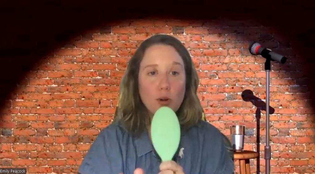 6:19pm EDT: Emily Peacock performs standup, with a Zoom background resembling a standup club stage. “Welcome to the South!” she begins.