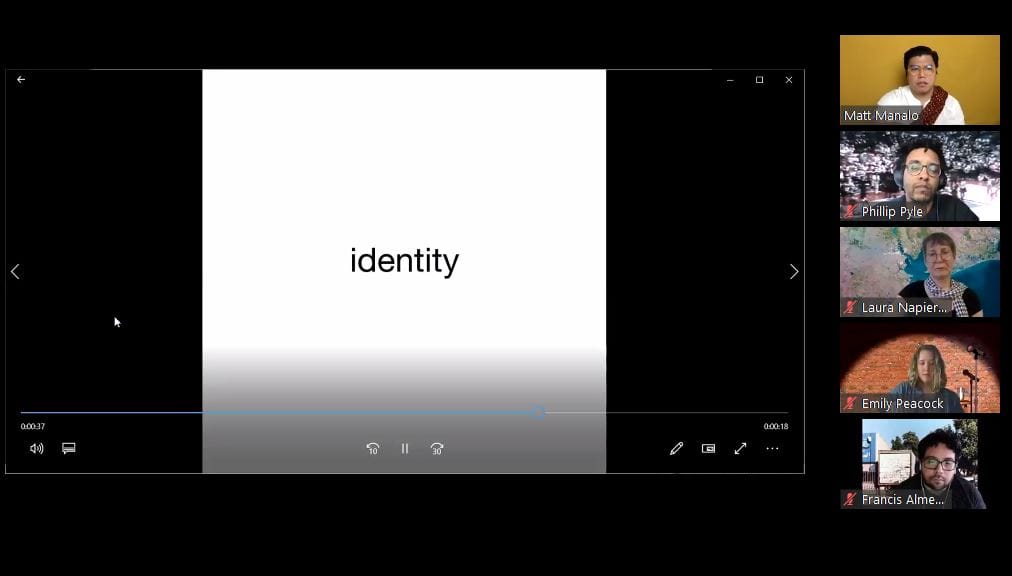 6:35pm EDT: DeHoyos asked participants to choose keywords from Manalo’s presentation: identity; queer; culture; appropriation; loss; language; oil; etc.