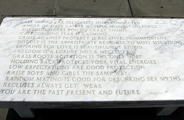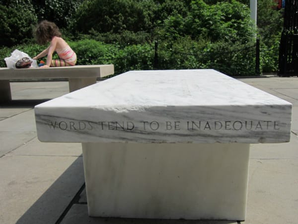 Jenny Holzer’s four benches are also beautiful takes on memorial monuments, with two “Truisms” pieces carved from Danby Royal Marble and two “Memorial Benches” made from Indiana Buff Sandstone, all engraved with Holzer’s cutting text. The “Trusms” benches have profound and somewhat didactic pronouncements like “Expiring for love is beautiful but stupid,” while the “Memorial Benches” are more lyrical, with one beginning: “Eye cut by flying glass/The child walks on a broken leg/Bone visible through the forehead…”
