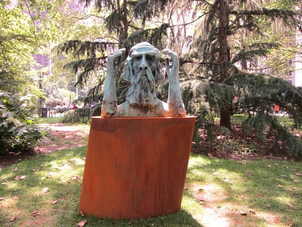 Another interesting approach to civic memorial sculpture is Thomas Schütte’s “Memorial for Unknown Artist,” a bronze upper torso of a man with raised arms, which he originally made for an exhibit inspired by the forgotten Swiss modernist Robert Walser. While the figure doesn’t look much like Walser, it does look like the mythic version of what an artist or writer is imagined to be: a long beard stretching down from a solemn face with a brow creased in thought. The bronze is worn down as if from the urban elements, giving it the same washed out surface as the old memorial sculptures one would find in Green-Wood Cemetery in Brooklyn, erected at a time before Central Park and the Metropolitan Museum when most notable sculptors’ had their most accessible work in graveyards.