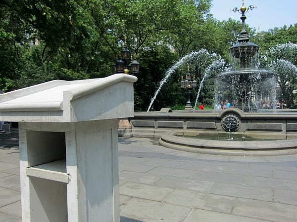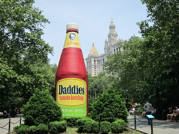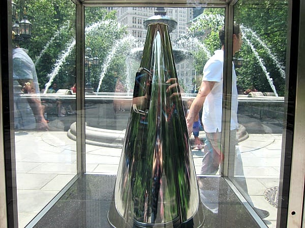 In addition to the spontaneous performances that may come from Amalia Pica’s work are two planned performance pieces, with one being Elmgreen & Dragset’s “It’s Never Too Late to Say Sorry,” which has an aluminum megaphone inside a glass case by the City Hall Park fountain. At some point during every day of an exhibit, someone will come and “activate” the art “according to the unpublished instructions of the artists.” It was not activated during my hour in the park, but I can imagine that it involves some yelling, and probably a dose of Elmgreen & Dragset’s characteristic humor. It would be great if it also somehow involved Pica’s concrete lectern, as the works in Common Ground are definitely each on their own island, with little dialogue due to their spacing in the park (it’s rare to see one from the other, except the 30-foot-tall ketchup bottle), and distinct artistic approaches.