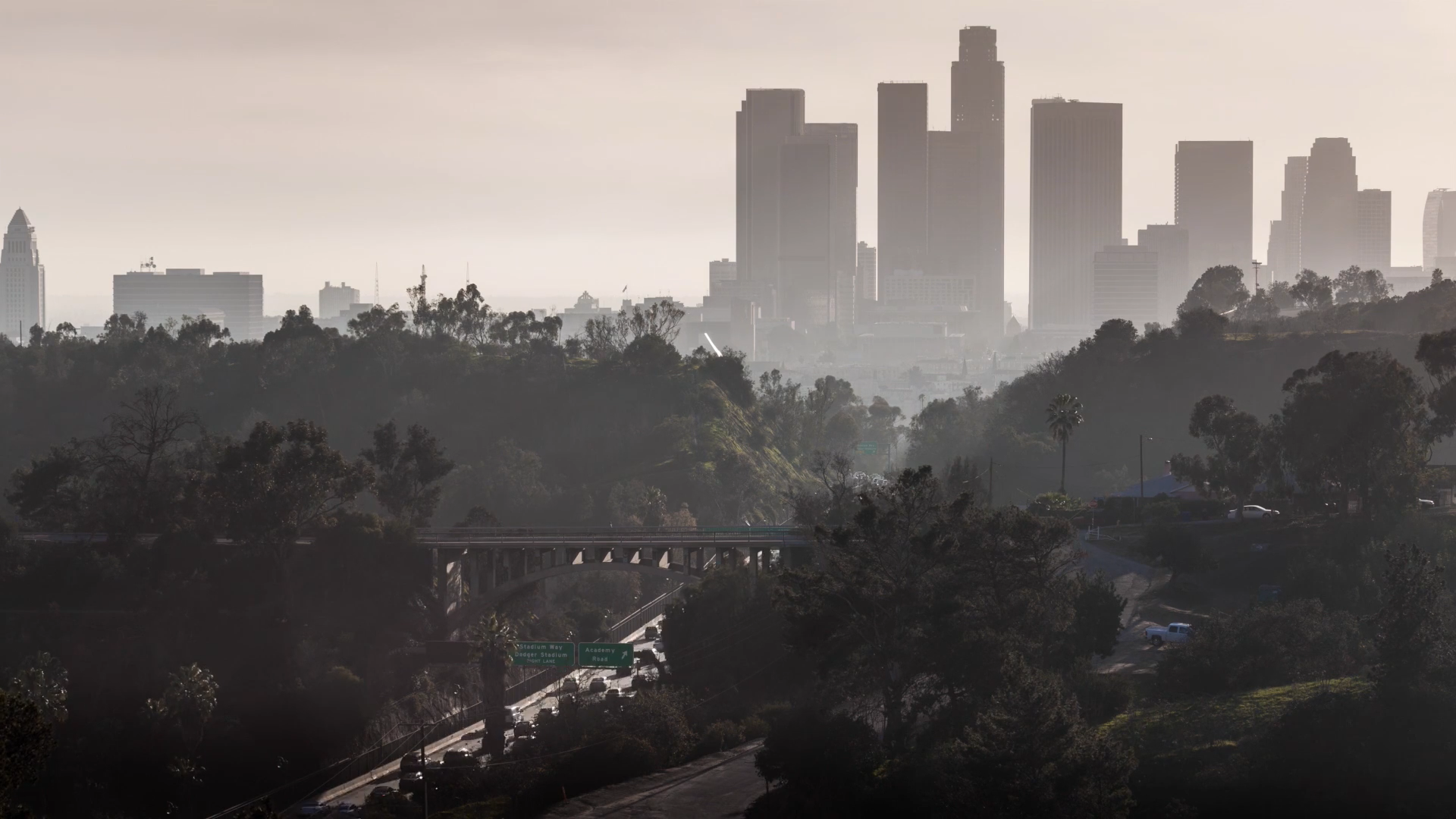 The film adopts an omnipresent point of view. One shot may be from the side of the freeway, while the next will be perched from atop a hill for a big panorama, and then the next will be seen through a car dashboard. Some scenes are of milieus so static that they might well be still images, while others capture the dizzying swarm of activity within these spaces. The movie’s progression is purposeful, moving along the 110 from the mountains and then south over the course of its runtime, the day transitioning from morning to evening along the way. It’s like the travelogue of a roving spirit, able to observe people at work and pigeons at play with equal curiosity.
