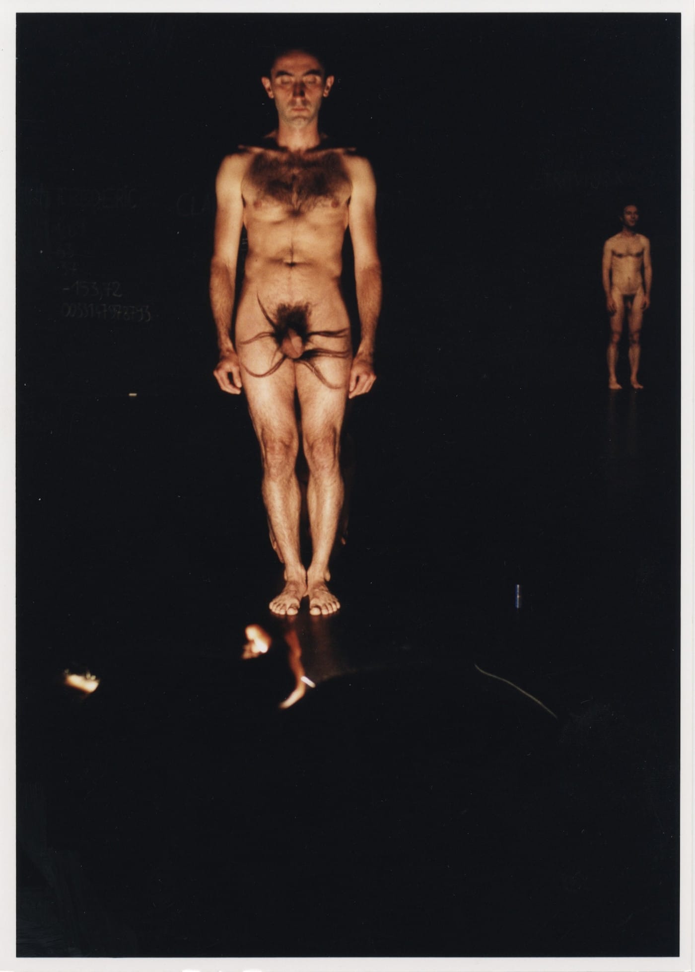 As part of Crossing the Line, Bel’s 1995 eponymous performance, Jérôme Bel, was co-presented by and at The Kitchen in a New York premier. The performance, which was the second piece of choreography he ever created, displays the bodies of the four performers, who are naked throughout. They write their names and body specs on a wall at the back of the stage, to stress that they are not representing someone else’s story or persona. A light carried by one of the four, an older woman, illuminates the stage. In one sequence, a woman pinches her rolls of fat and stretches her skin around her body. There is some puppetry of the penis by a male performer, whose pubic hair is arrayed artfully around his genitalia. The performers use a red marker to write on their bodies. One of them pisses on the floor, and they use the piss to wipe away the body specs written on the wall.