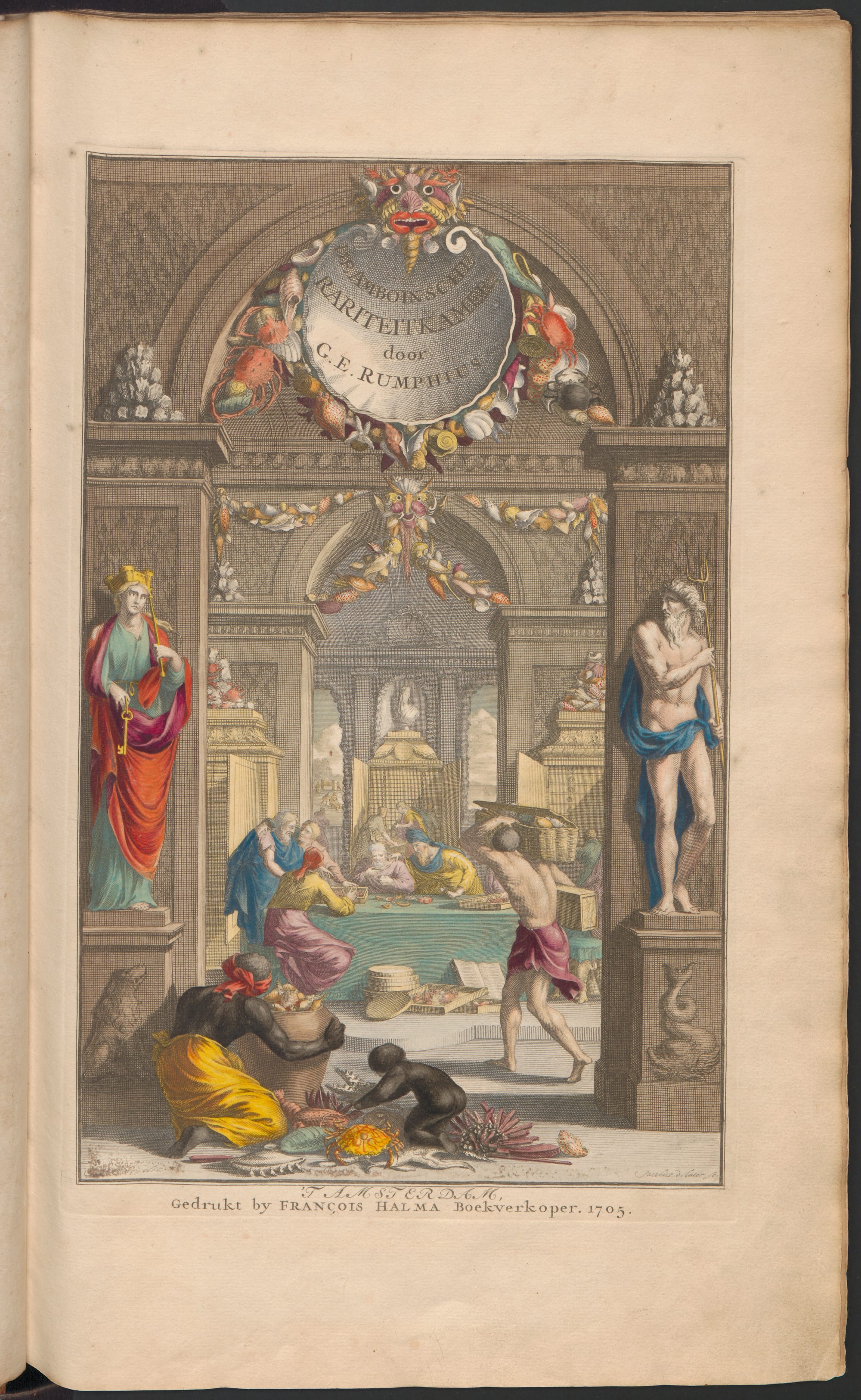 Though most Europeans ignored this phase of their shells’ lives, the process is alluded to in a hand-colored engraving and frontispiece of "The Ambrose Curiosity Cabinet" (1705), where two Black figures — one just a small child — gather rare shells on the ground outside of an elaborate chamber while European men sort and speculate over these imported luxury goods at a large table inside.
