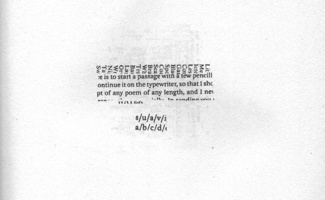 A sequence of these “rotating prisms” (Howe’s phrase) makes up “Concordance,” the central long poem of Concordance’s three sections. Howe’s source texts are sometimes recognizable even in their fragmentation: concordances of canonical poets; annotated and facsimile editions of their works; and various field guides to regional flora, fauna, and minerals. These word blocks contain lists of birds and of trees; phrases (sometimes in Latin or Greek) and page references; and even occasional flashes of continuous syntax, as on page 55: “e is to start a passage with a few pencill / ontinue it on the typewriter, so that I sho / pt of any poem of any lenth, and I nev […].”