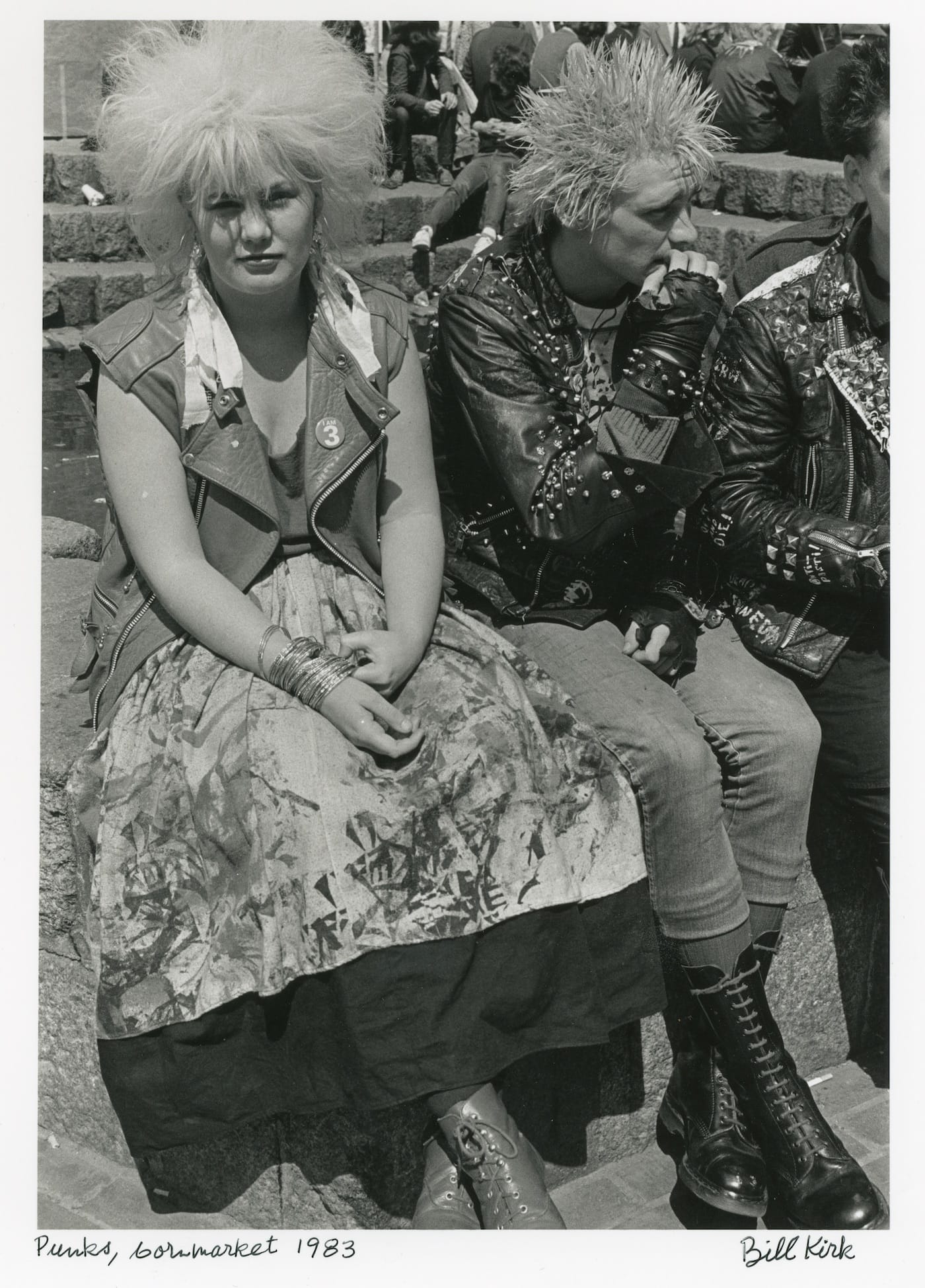 By far the most life-affirming photographs are the numerous portraits of Bill Kirk, attesting to a natural solidarity that persisted throughout the Troubles. Long-haired children of itinerant city dwellers, known as “travelers,” hold hands in an abandoned lot, their gazes so intense and reflective that they seem to be envisioning places beyond their violent, walled-off neighborhoods, as children so readily do. In other Kirk photos, unfazed commuters ready their bags for inspection at city checkpoints, or congregate in their Sunday best as they assist one another with milk distribution.