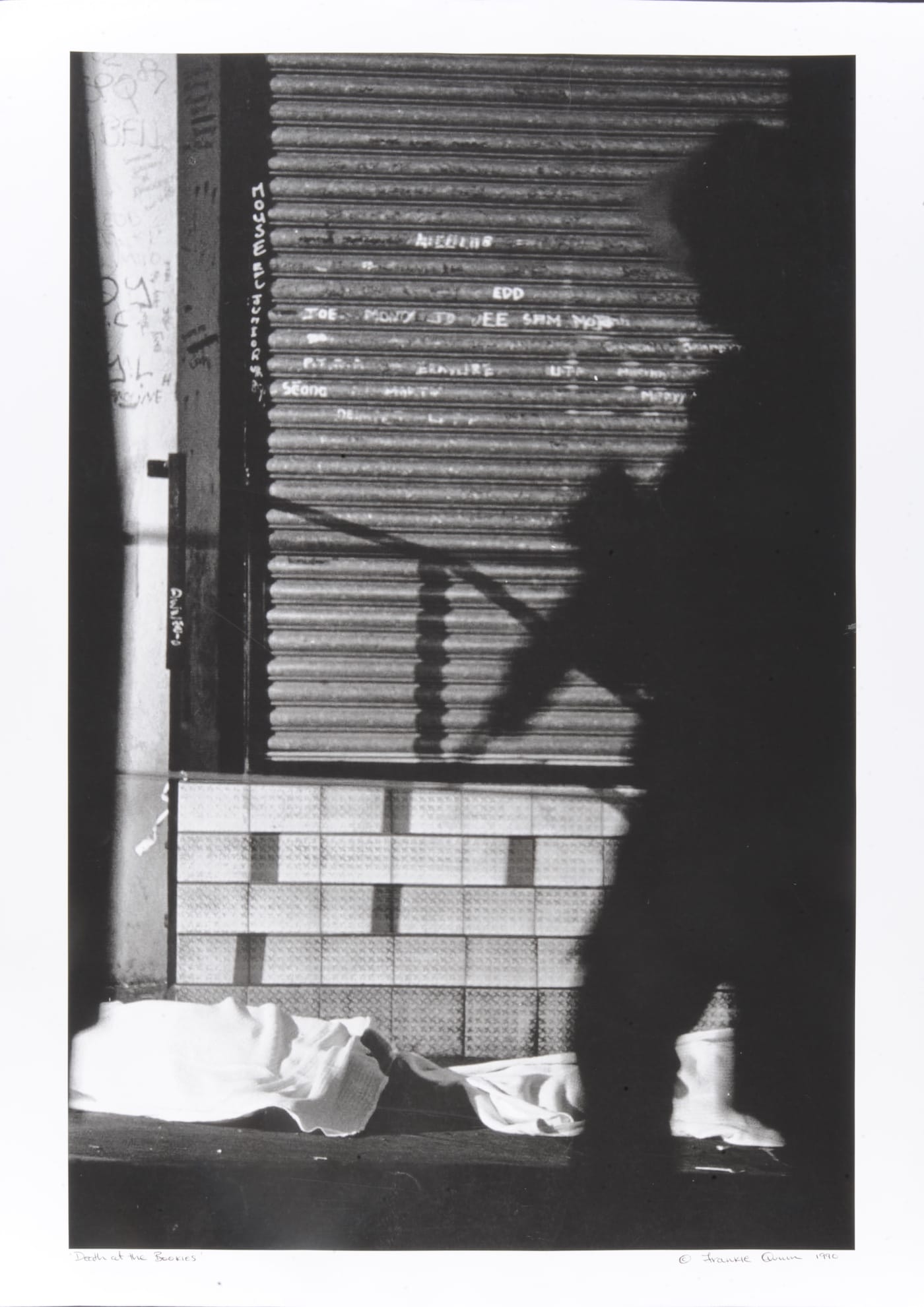 Private grief often becomes public spectacle. Photographer Frankie Quinn documents the mid-1990s confrontations in the town of Portadown during funerals and parades, scenes that foreground police violence; a man with a gouged and bloodied forehead is escorted to safety by friends; another protestor karate-kicks a shielded police officer; still others are dragged off the streets by angry cops. In another series, army troops push into Derry’s city center while indifferent pedestrians walk through their ranks in the opposite direction, tending to their own errands and appointments.