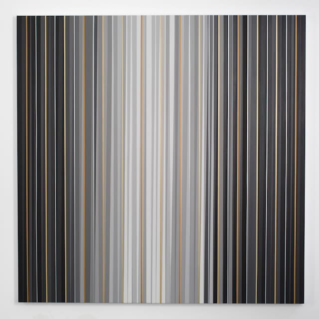 Evertz’s painting, “Grays and Metallics (Aedicula), The Black Room Series” (2014), is a series of vertical stripes arranged in what appear to be two layers, one achromatic, with varying shades of gray, white and black acrylic, and the other chromatic, in gold, silver and brass-colored metallic paint. The dark-to-light-to-dark progression of the acrylic stripes become an illusionistic grille, as the metallic paint, laid out in thin lines, floats on top.