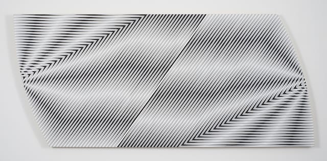In “Dual,” the colors are white and black beneath a top layer of silver. The silver is plotted out as a single angle emanating from the two curved sides of a quasi-parallelogram, which has been shaped from a laminated wood panel. The inward-pointing vertices are repeated until the one that started on the left disappears off the top edge, while the one on the right sinks below the bottom. After the vertices’ disappearance, the two remaining arms become independent diagonals that meet at the center of the panel, seemingly splitting it in two.