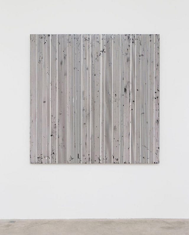 The centerpiece — and the standard bearer for the theme of breaking pattern — is Michael Scott’s 63-inch-square “#98” (2012) in black enamel on aluminum. Dominated by vertical lines on a white field, the surface is flecked with small smudges of black paint. The effect is odd, jarring: the precision of the tightly laid-out lines enhances the poignancy of the blemishes, while the errant marks, which are seemingly random, reassert both the primacy of the surface and the object-ness of the painting.