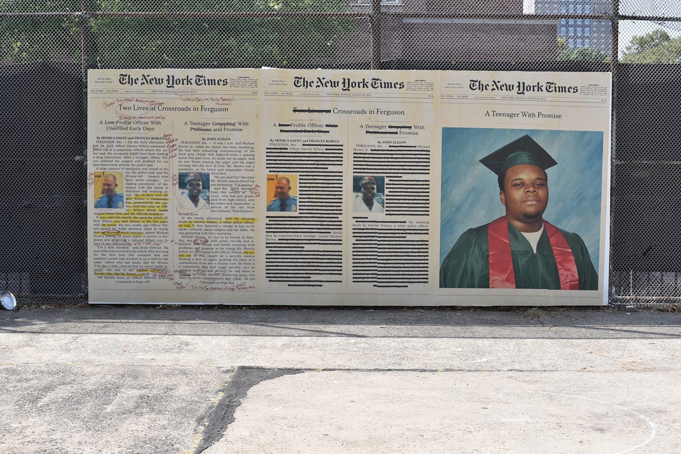 This weekend at MoMA PS1, five artists and writers will offer some clear-eyed correctives amid the confusion. As part of its VW Sunday Sessions, the museum will present “Radical Edits: Reassessing Cultural Narratives.” The afternoon of panels, screenings, and discussions takes off from Alexandra Bell’s “Counternarratives,” a public artwork that inserts “radical edits” into supersized images of newspaper headlines. (Her diptych on the murder of Michael Brown, for example, “edited” the Times’s original copy to read “Officer Darren Wilson fatally shot an unarmed black teenager named Michael Brown.”) MoMA’s event will feature Bell (“Counternarratives” is also on display in the musuem’s courtyard November 9–18) along with Sable Elyse Smith, Kameelah Janan Rasheed, D0UZE, and Devin N. Morris, all presenting ways of seeing things as they are and offering “more equitable narratives.”