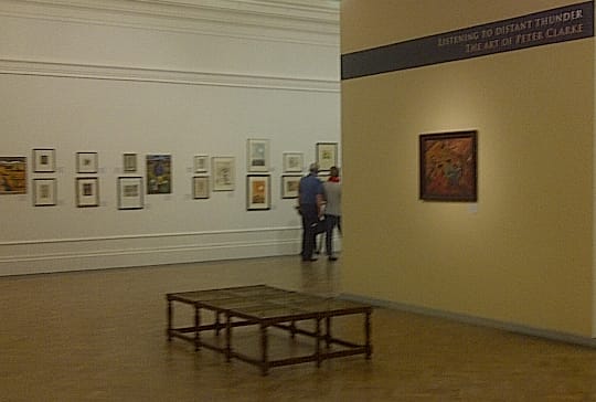 Rounding the first corner, I come across a pleasant selection of James Barnor’s black and white photographs, collectively entitled Ever Young after the name of his photography studio in Accra, Ghana. I’m not sure if this is a retrospective or a long series of his work and there is little hint at the social dialogue or “African” context. In short, the exhibition appears vapid and offers little rhyme or reason for it being shown at the National Gallery in South Africa. Mildly disappointed, yet optimistic, I walk on to two large rooms of paintings. Hung in what seems to be an attempt at a “salon style”, I encounter Peter Clarke’s work — a mish-mash displayed in a manner akin to that of a flea market. If this were intentional it may have been quite cool — but alas, not. In the middle of the every-square-inch-covered wall is a video room with a short film of Peter Clarke being interviewed in his home. I walk to this for redemption. It’s mildly interesting except I can’t help but think of the sensational William Kentridge video I had seen in the same room a year and a half prior.