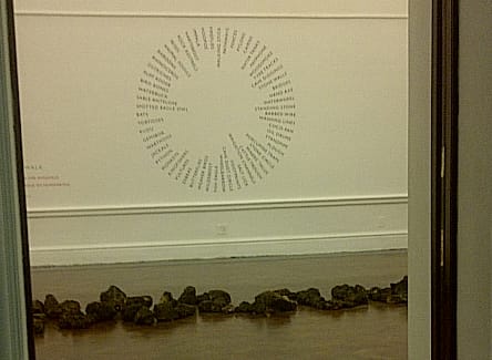 Thankfully, I find an unintentional moment of salvation — a side space adjoined to the education room as part of the Richard Long exhibition. It’s a small curtained room filled with mud and water that invites the audience to create wall drawings and rearrange a pile of rocks “Long-style” in any desired format.