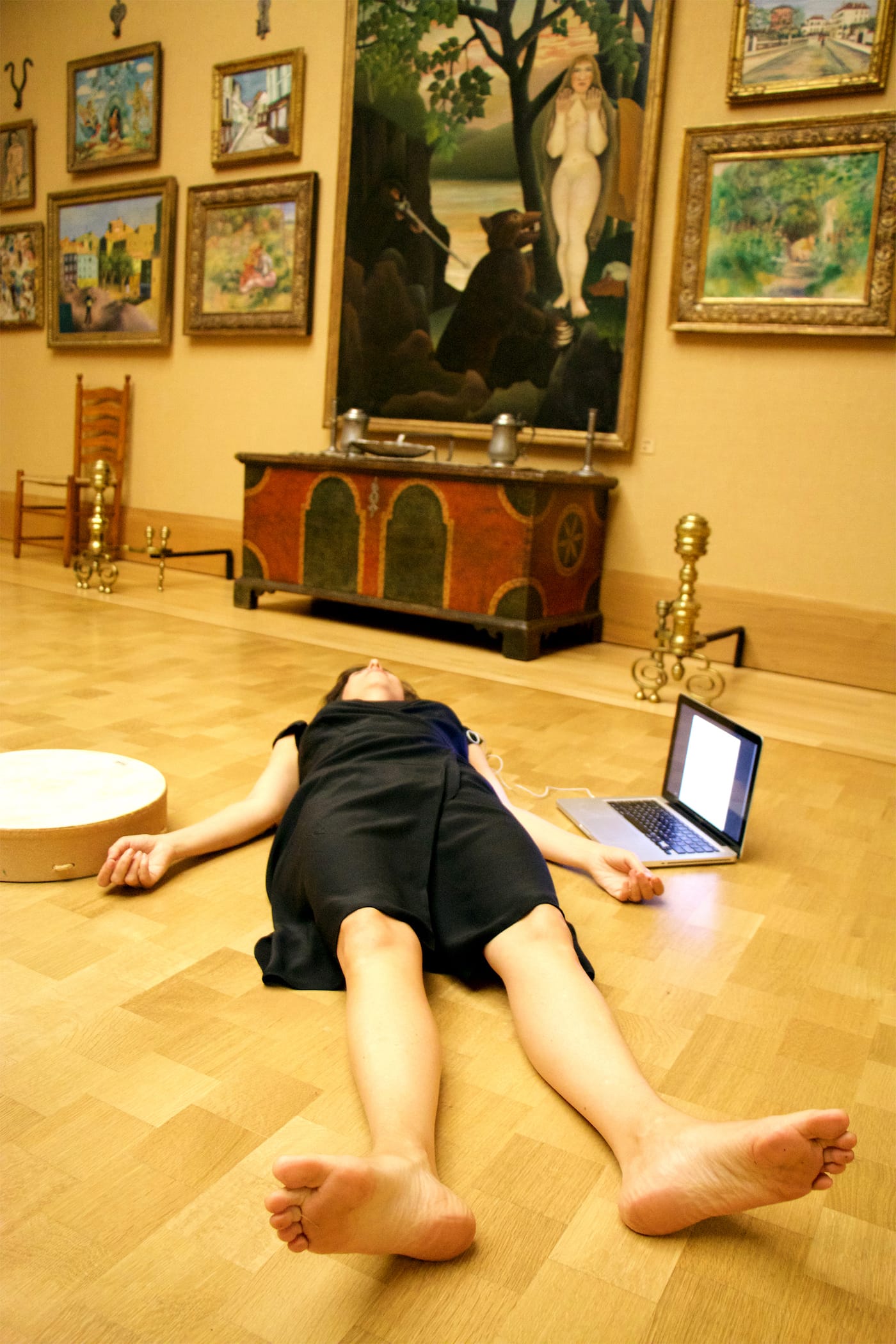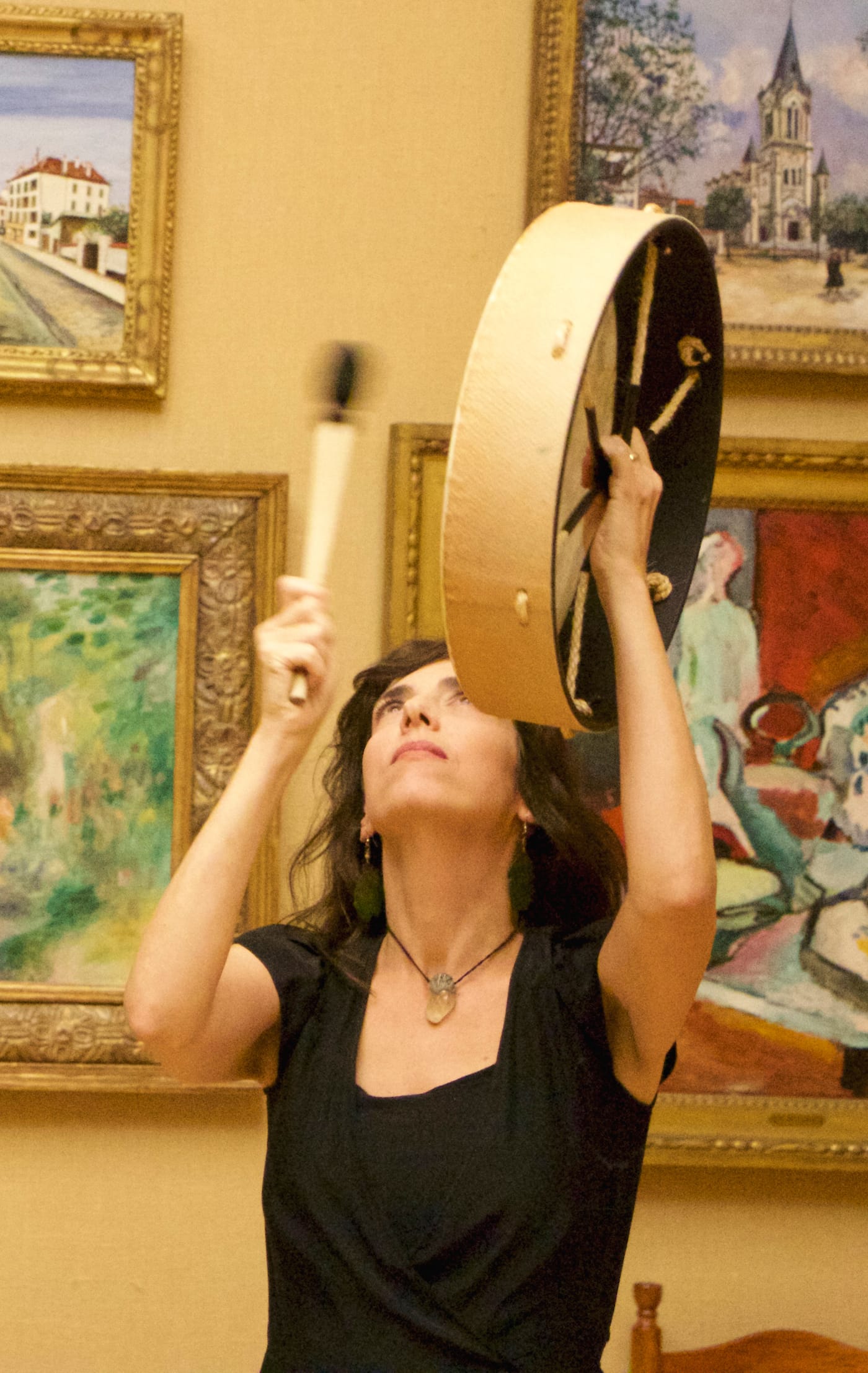 As with her series Journey, Hornick used shamanic drumming to conjure the animal spirits and tap into the inner ruminations of painted subjects for Unbounded Histories. In Hornick’s poems, animal forms, as well the figures in the paintings, transcend specific works and reappear in her discussion of other ones. In the first room, we are told that the bulls of Picasso’s “Composition: The Peasants” (1906) descend from their painted landscape of golden hay into the gallery with flowers in their mouths, while the bored woman in Corot’s painting joins a tea party with Seurat’s nudes in “Models (Poseuses)” (1886–1888). A metal 18th-century hinge mounted sideways on the wall is identified as bullhorns that allude to female fallopian tubes as a sign of fertility. As the narrative comes to a close, ending the journey in room one, the bulls from Picasso’s “The Peasants” freely romp in and out of the paintings in the hope that the museum guards do not notice.