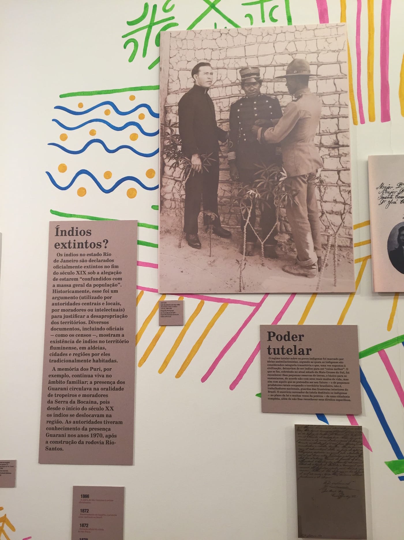 Significantly, the exhibition concludes with the history of the Aldeia Maracaña. In 2006, José Urutau Guajajara, a leader in the movement for indigenous rights, along with several other people of various indigenous ethnicities, founded the Aldeia Maracaña (Maracaña Village). They set up camp in an abandoned building that once housed the Museu do Índio, which had moved its operations to new headquarters. The building is next to the Marcaña stadium — the site of the 2016 Olympics and the 2014 FIFA World Cup Finals — and the community occupied the space until a violent eviction in 2013. (A documentary on the eviction was screened at the museum this past October.) The occupants, who’d effectively created a kind of village, were taken to government-offered land in Jacarepaguá, where the infrastructure was poor and the restrictions were heavy. The state government then threatened to demolish the building to increase the size of the Maracaña parking lot; after much resistance, it was announced the Reference Center for the Culture of Indigenous People would be established there. This never happened. In spring of 2017, a reoccupation of the former museum took place.