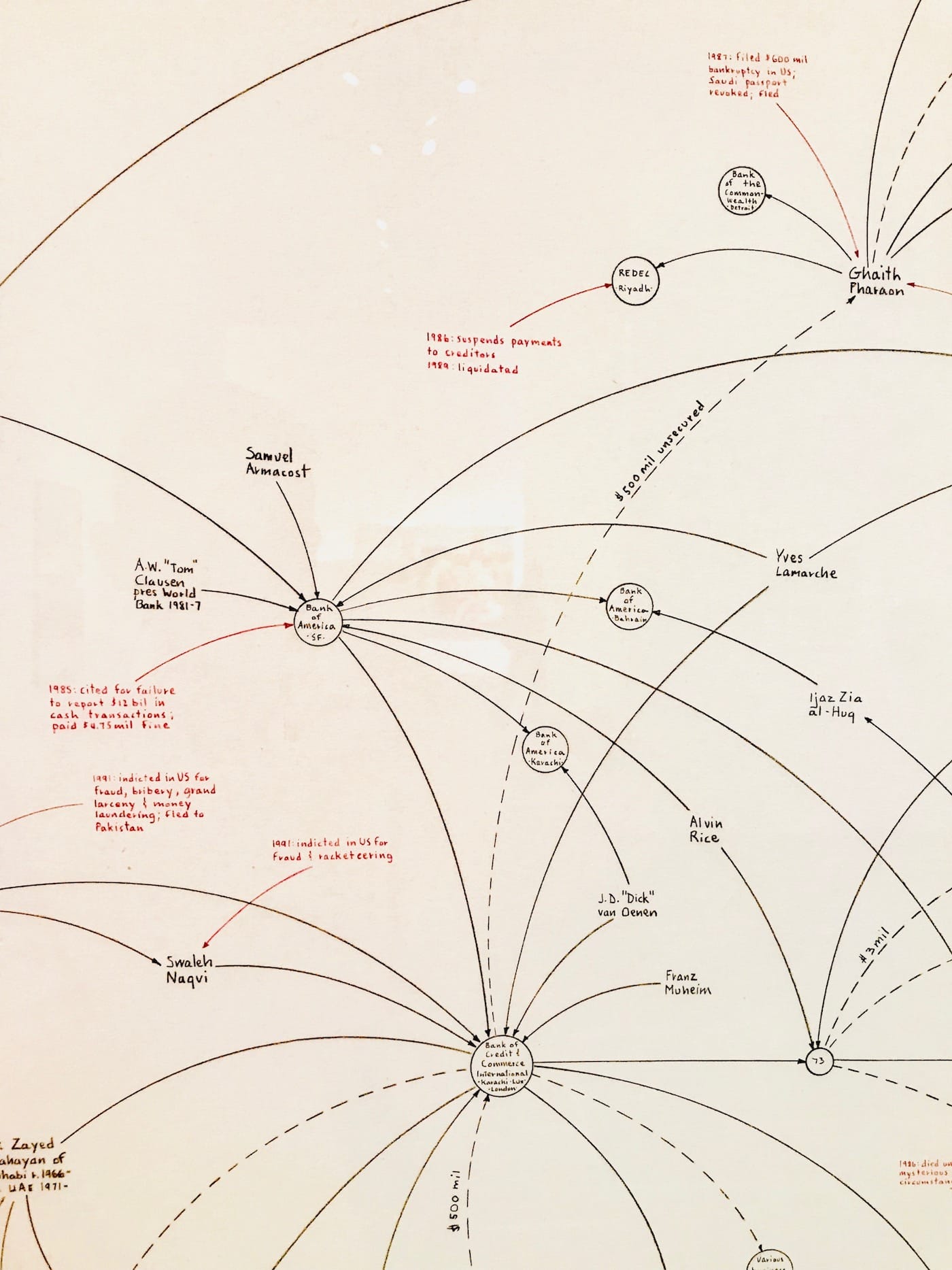 The counterculture conspiracies of the 1960s and 1970s gradually gave birth to a post-Watergate generation of artists concerned with following the facts. The money trail that ties governmental, corporate, and criminal organizations particularly fascinates Mark Lombardi, who here displays a conspiracy chart that details the murky financial transactions between the United States and Gulf countries through the Bank of Credit and Commerce International (BCCI) from 1971 until the institution’s demise in 1991. American and British investigators found that the BCCI had been set up to deliberately avoid centralized regulatory review to operate extensively in bank secrecy jurisdictions for the purposes of laundering money and weapons, for example, during the Iran-Contra affair.